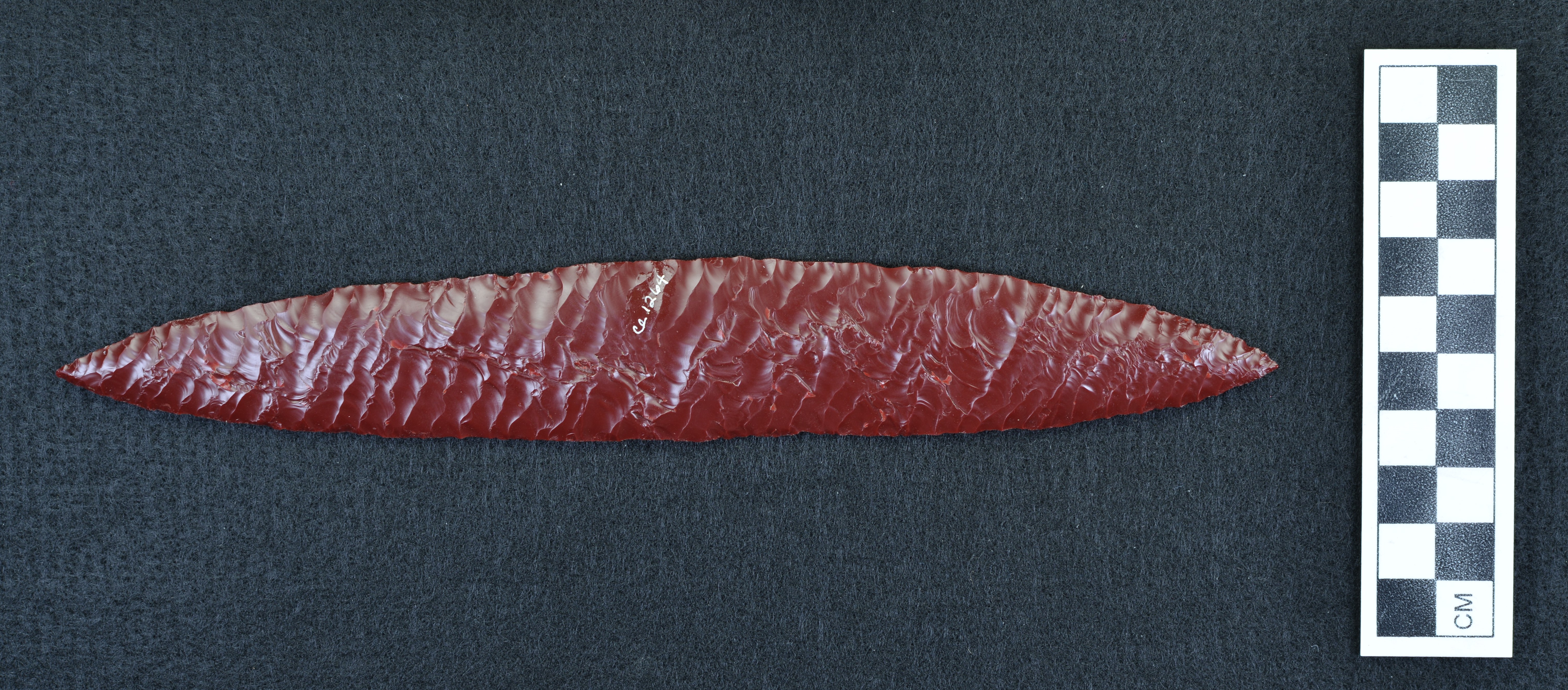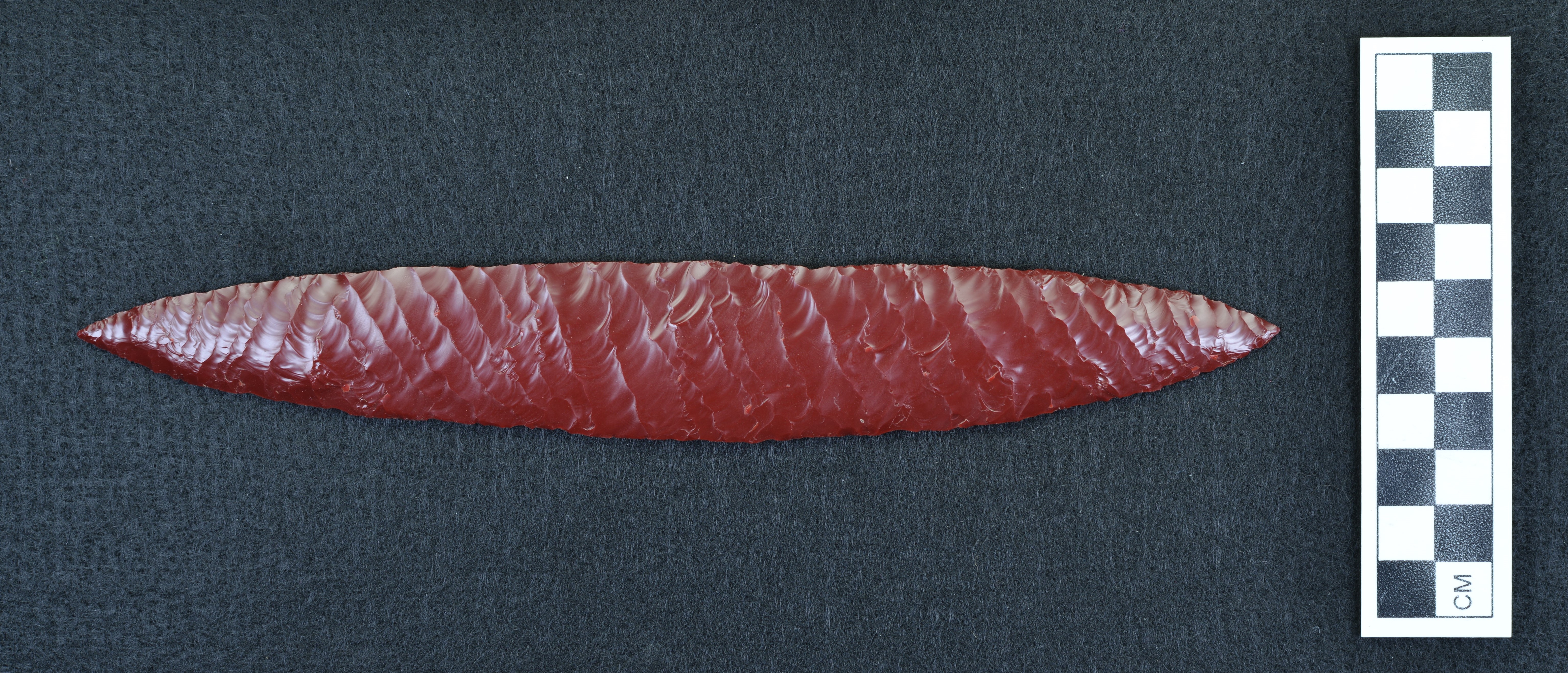- Large, opaque red glass, biface. Created using the Titmus on one side, Crabtree technique on other. Crabtree technique is shown on this side