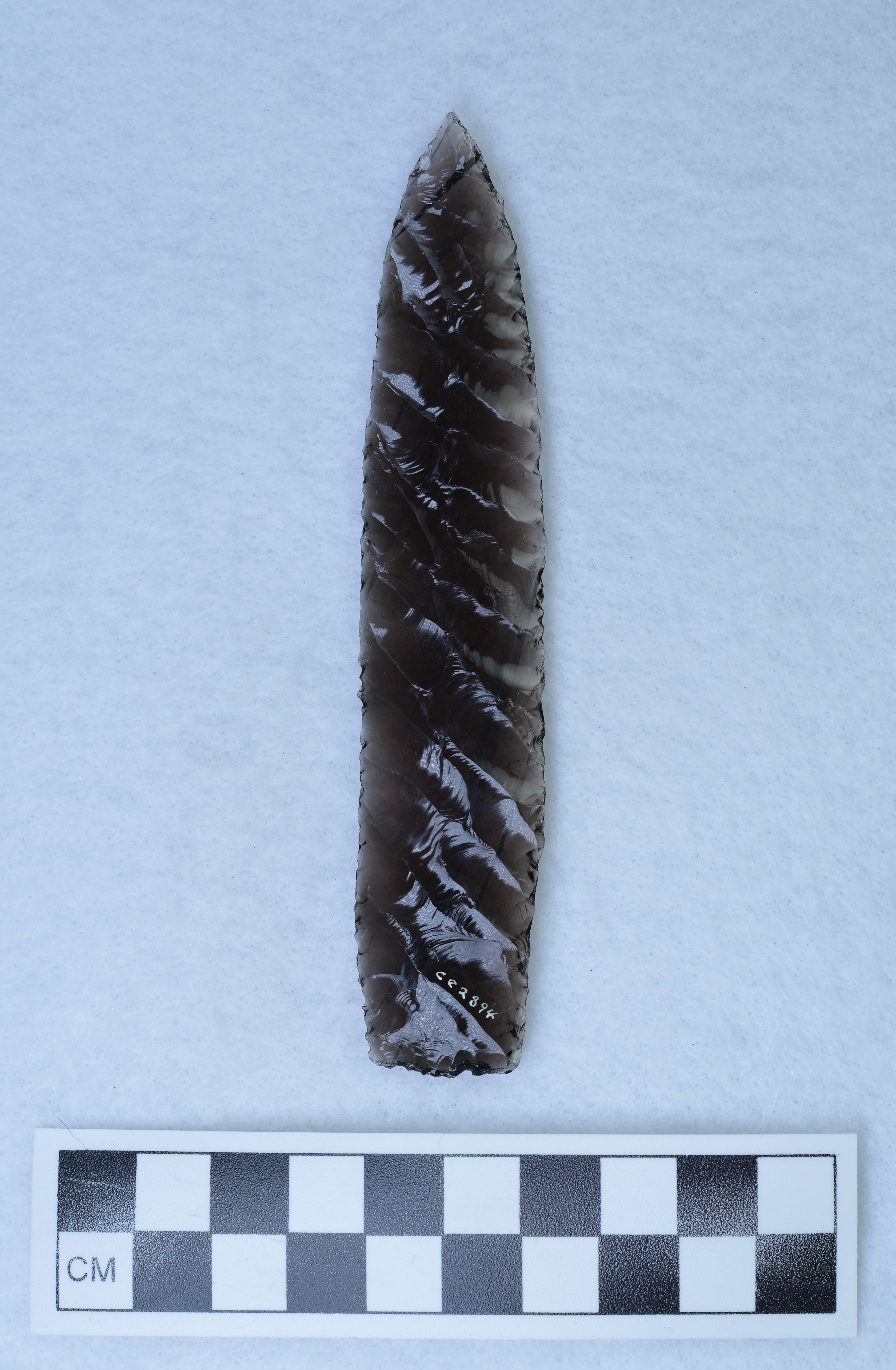 - Parallel flaked, one face has narrow flaking, lanceolate style, Other face wide flaking. (GT)