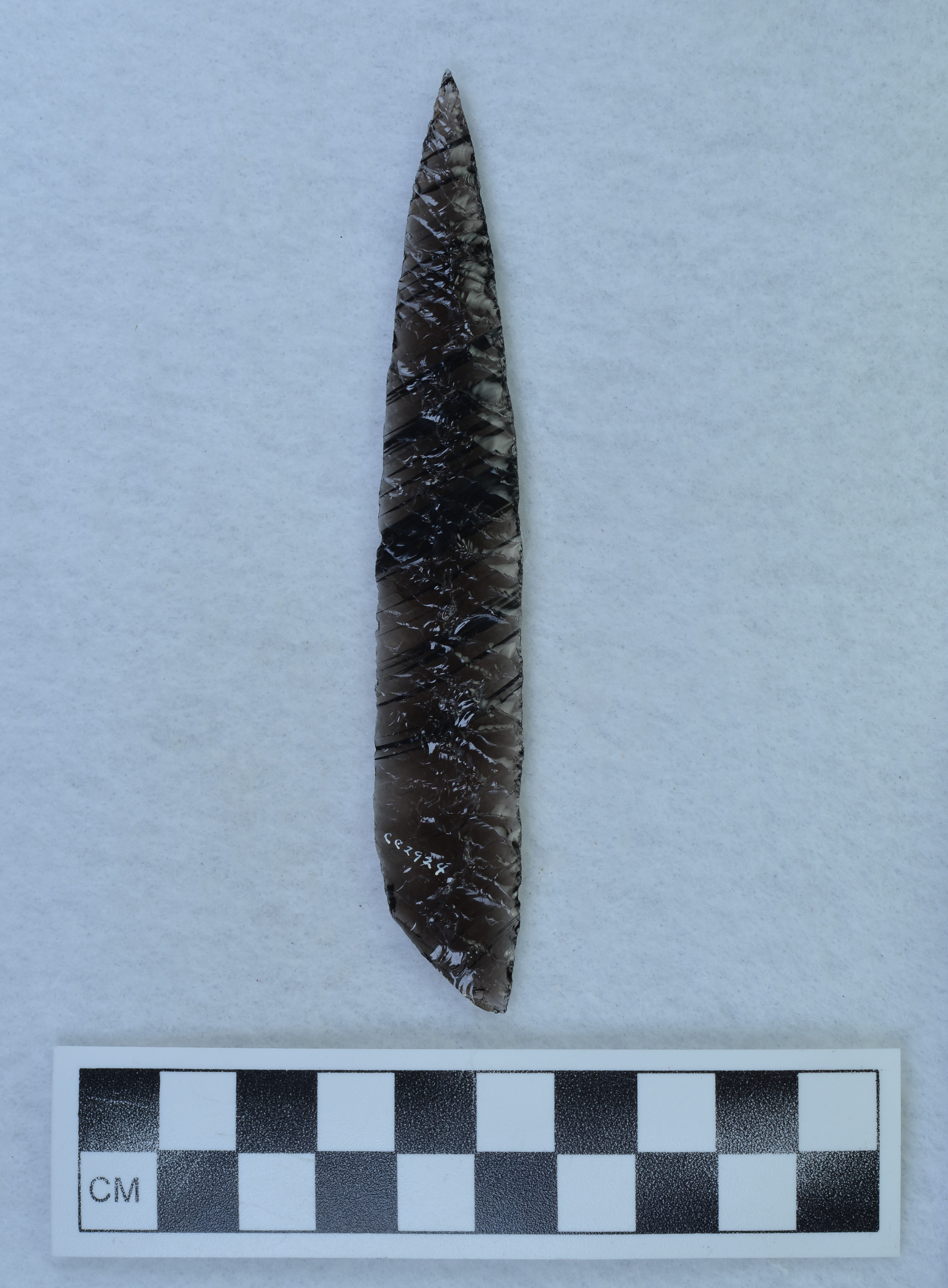 - Narrow parallel diagonal flaking, Cortex on proximal end. Appears to have been sawed. (MAP) RLS & LE-J agree on cortex. Disagree on sawn blank. 2-1-22