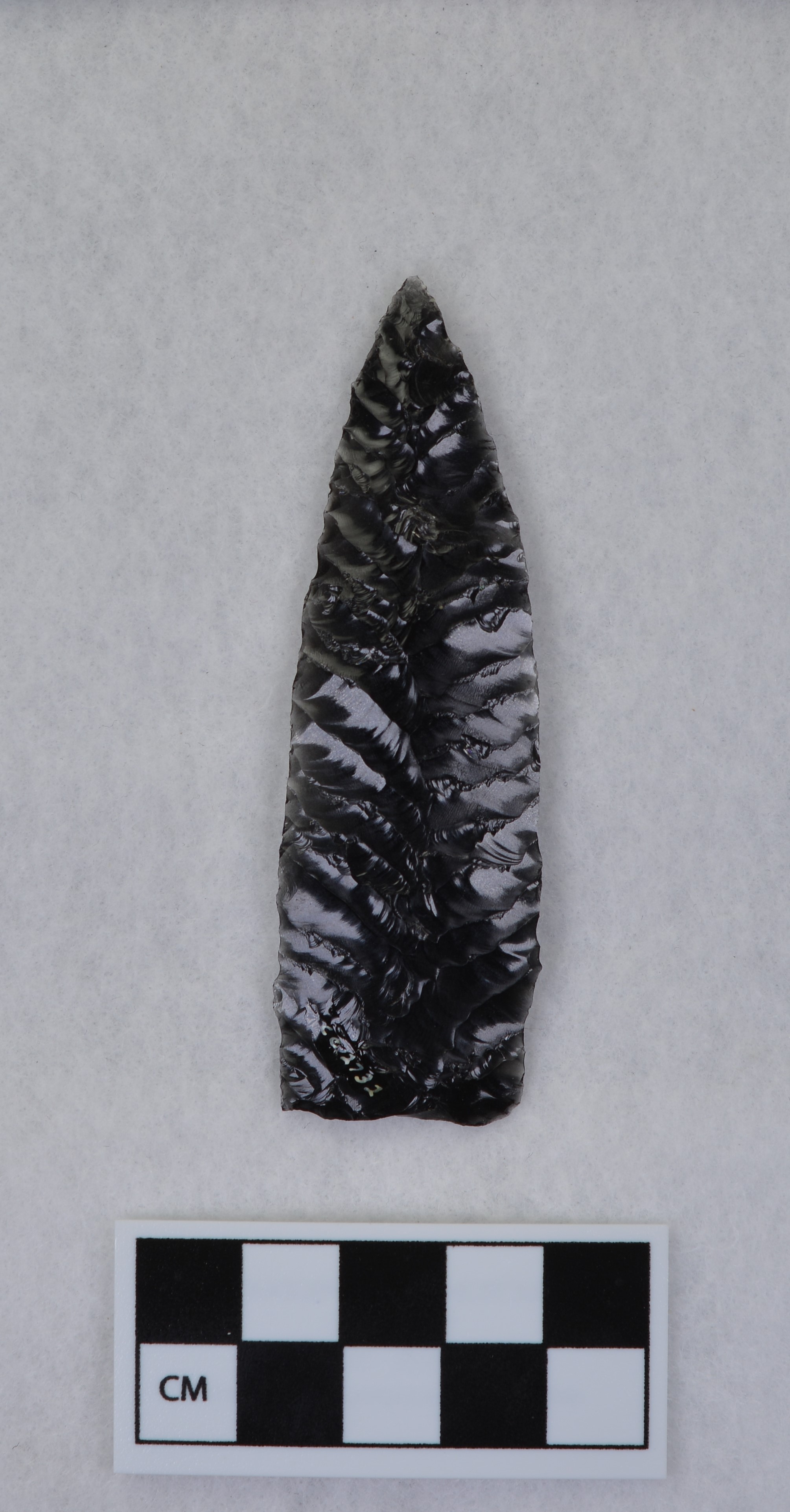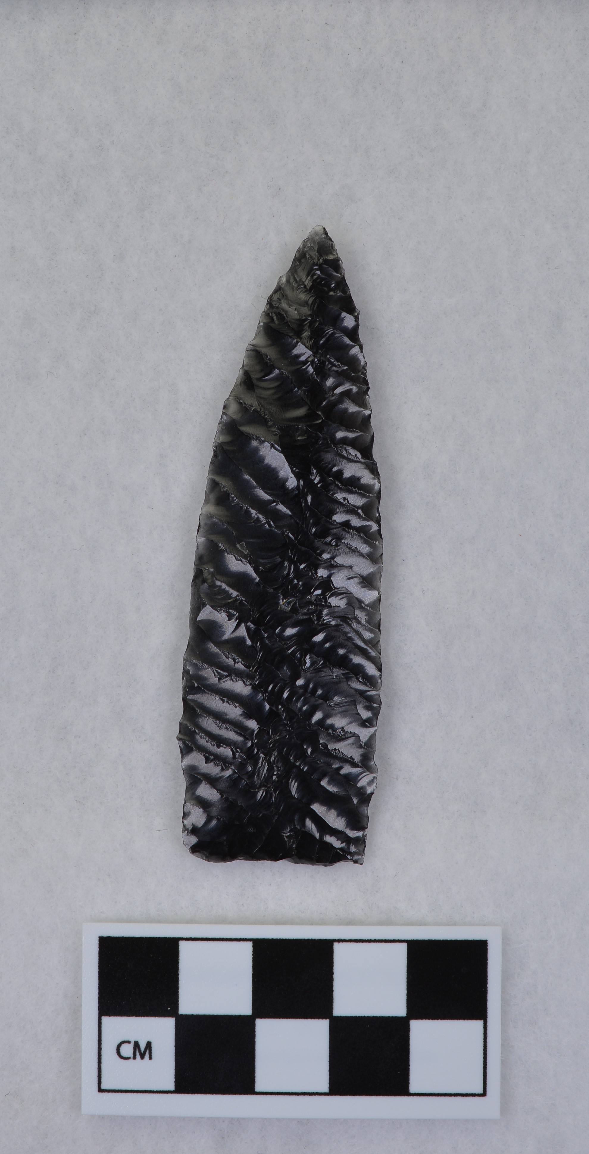 - One side chevron flaking, lanceolate style, basal margin lightly ground, base thinned