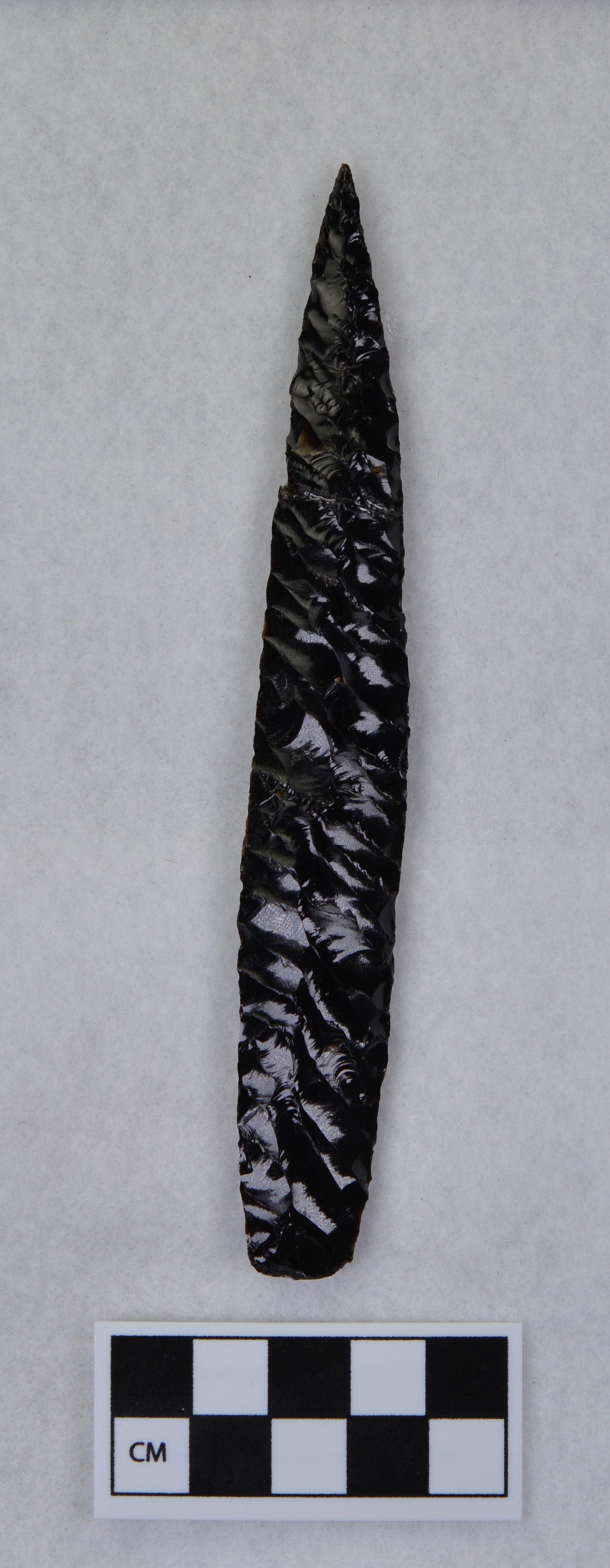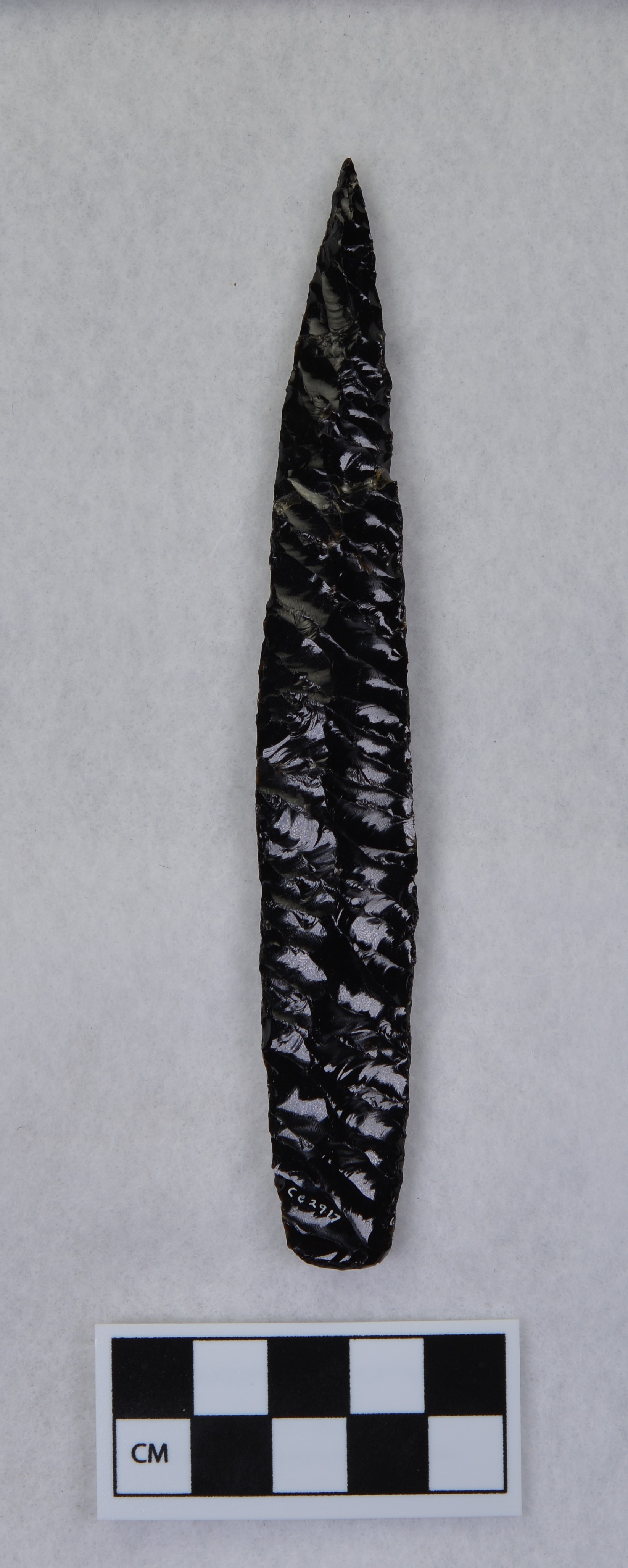 - Parallel diagonal flaking, broken/glued in multiple places, lanceolate style, basal margins ground and thinned. May be glass, not obsidian. (MAP)