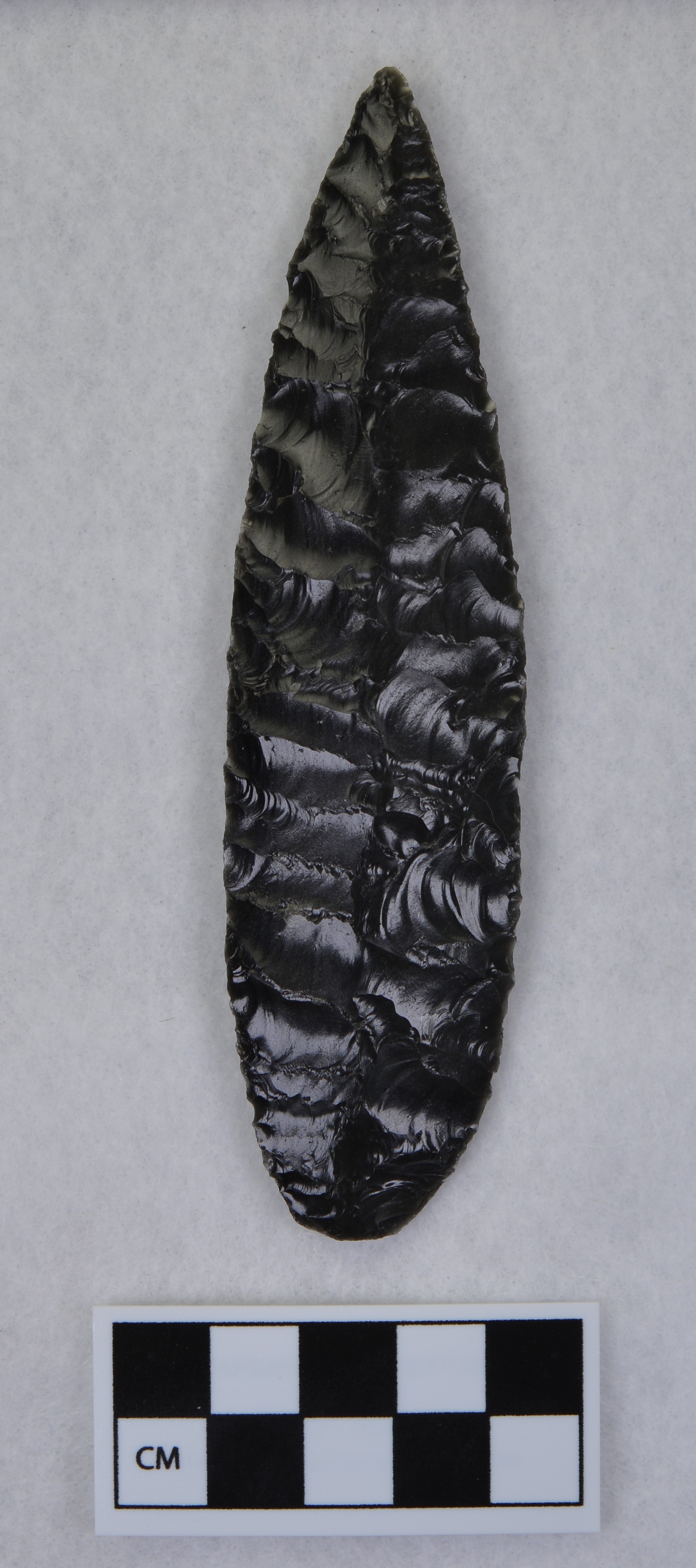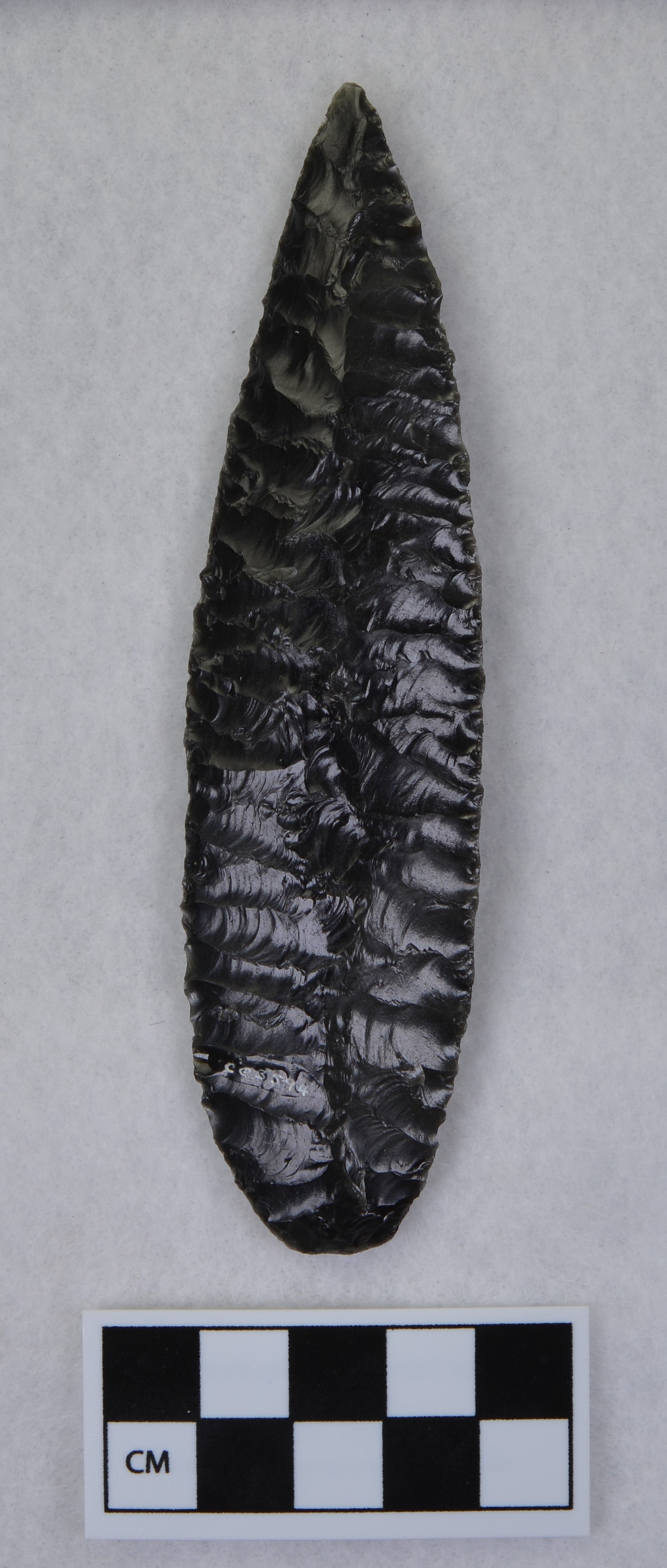 - Flaked to midsection to form dorsal ridge, lanceolate style point, ground and thinned basal margins