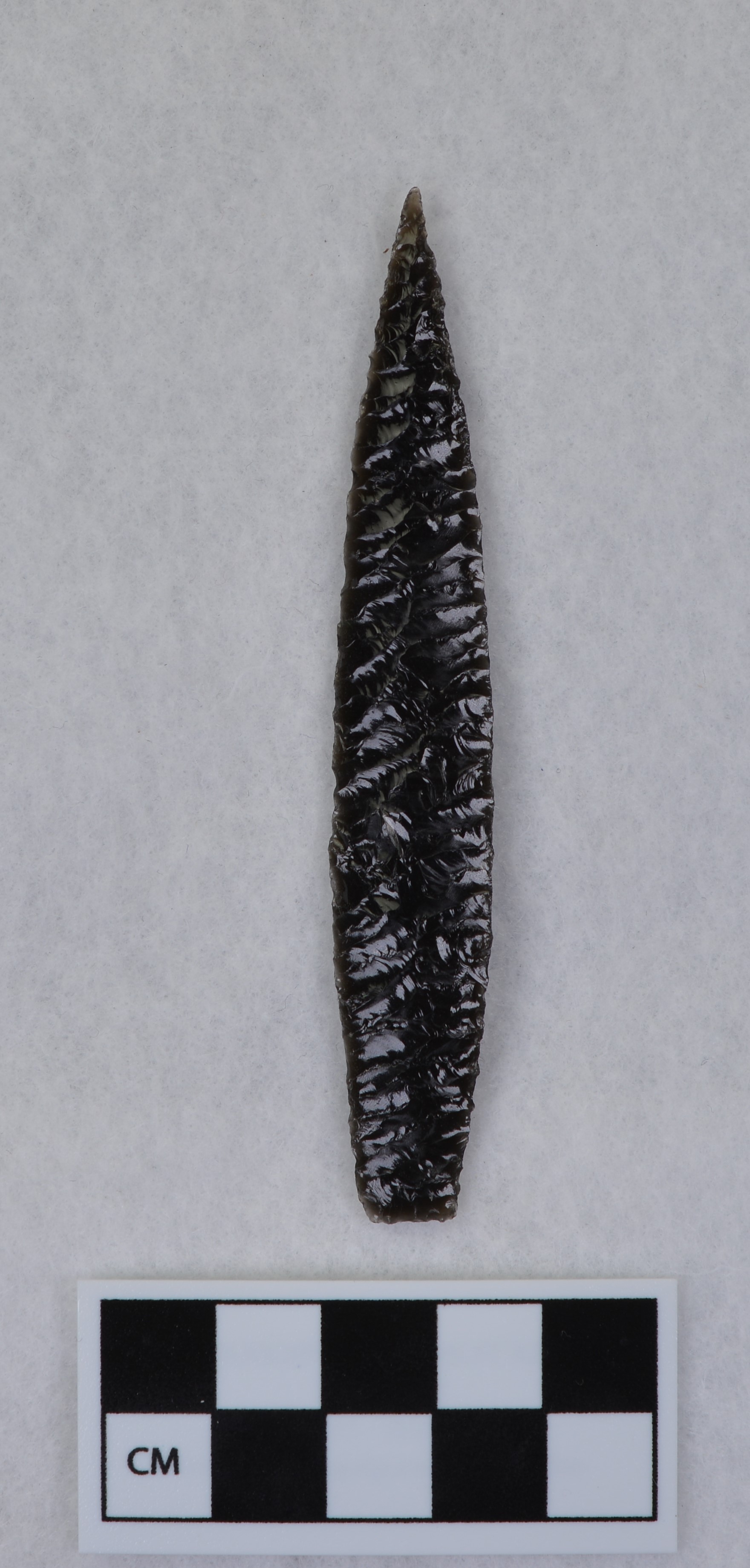 - Titmus technique, parallel diagonal flaking, lanceolate style point, ground and thinned basal margins