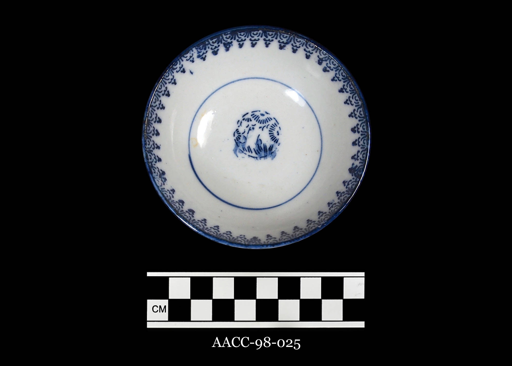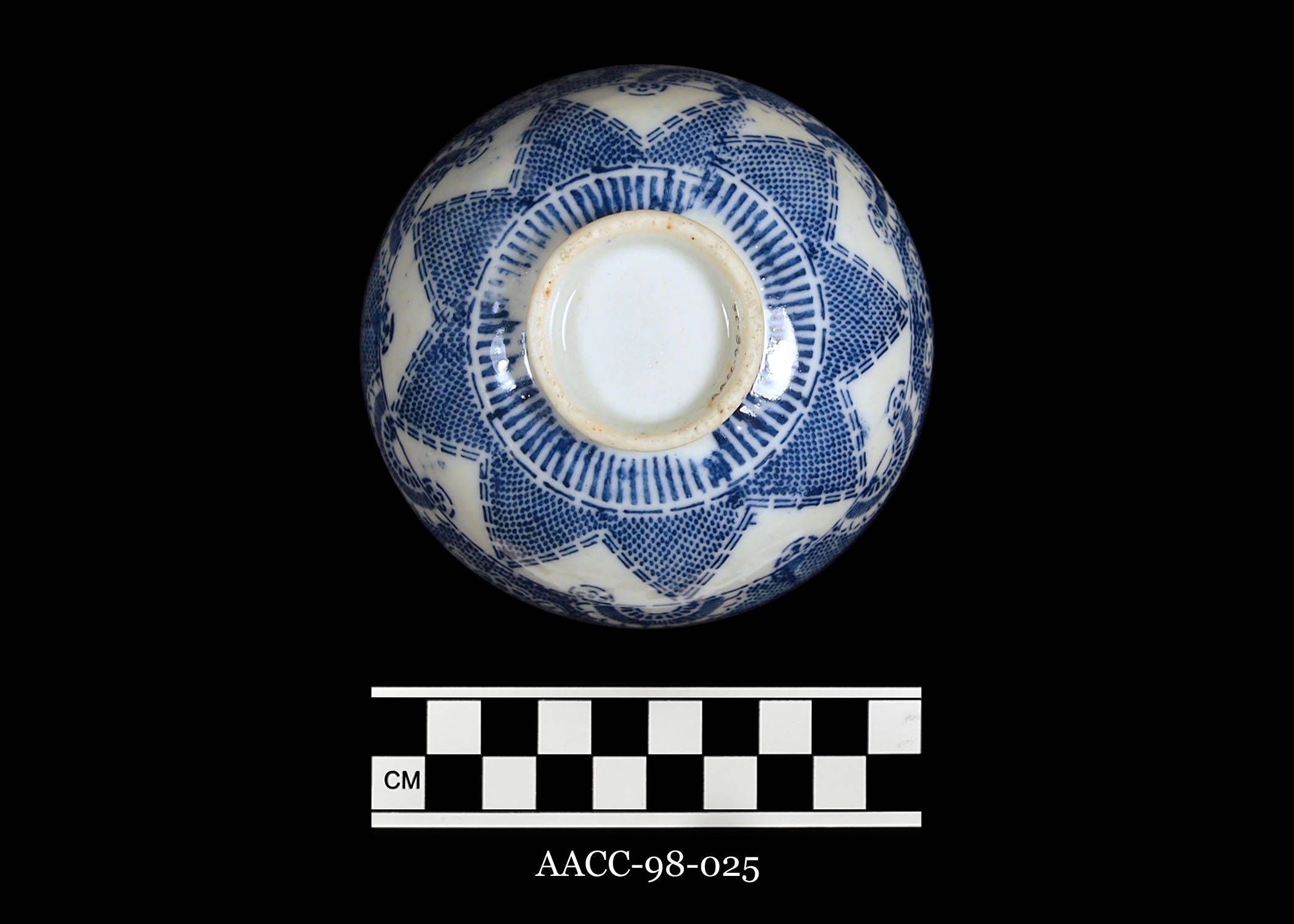 Bottom of Sometsuke Katagami Sho Chiku Bai Kobachi (small bowl with cobalt stenciled three friends design)