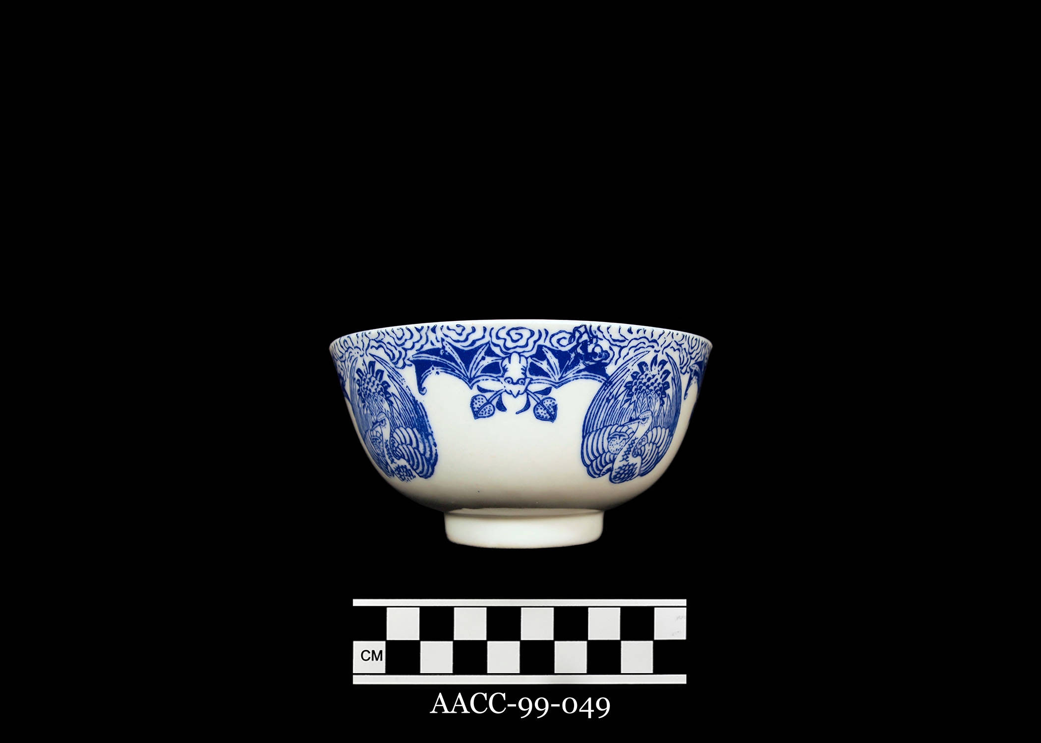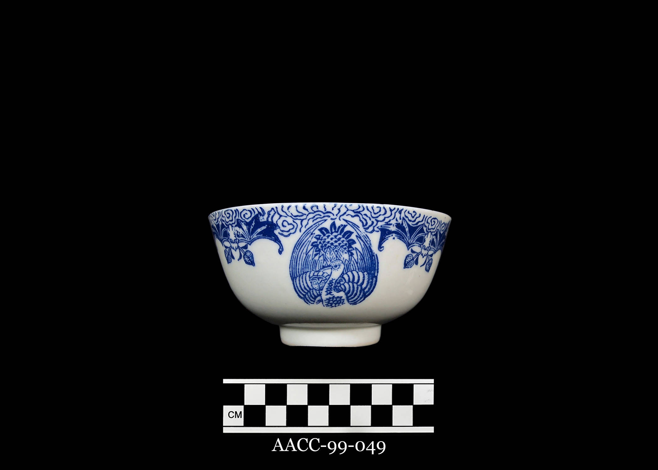 Side of Sometsuke Doban Tsuru Komori Gohan Jawan (rice/soup bowl with cobalt transferprint bat and crane design)