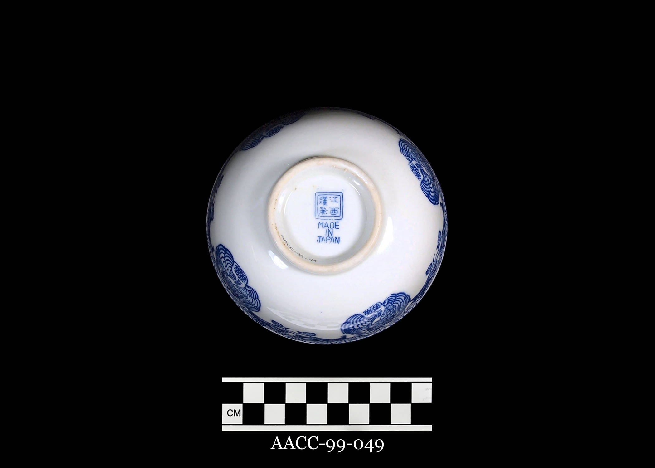 Bottom of Sometsuke Doban Tsuru Komori Gohan Jawan (rice/soup bowl with cobalt transferprint bat and crane design)