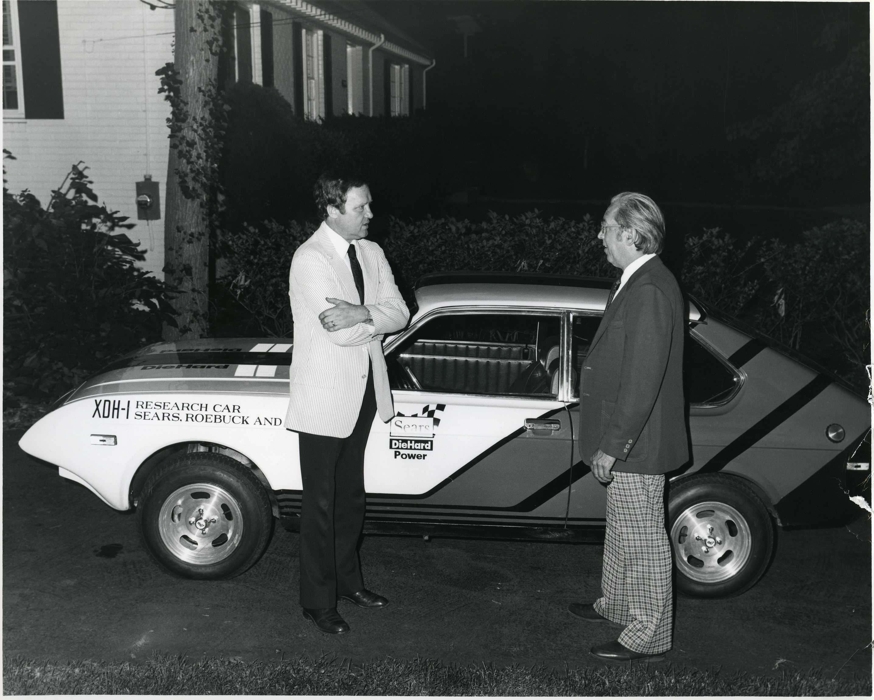 - Senator James A. McClure stands with an unknown person next to a car labeled XDH-1 Research Car Sears, Roebuck and Co.