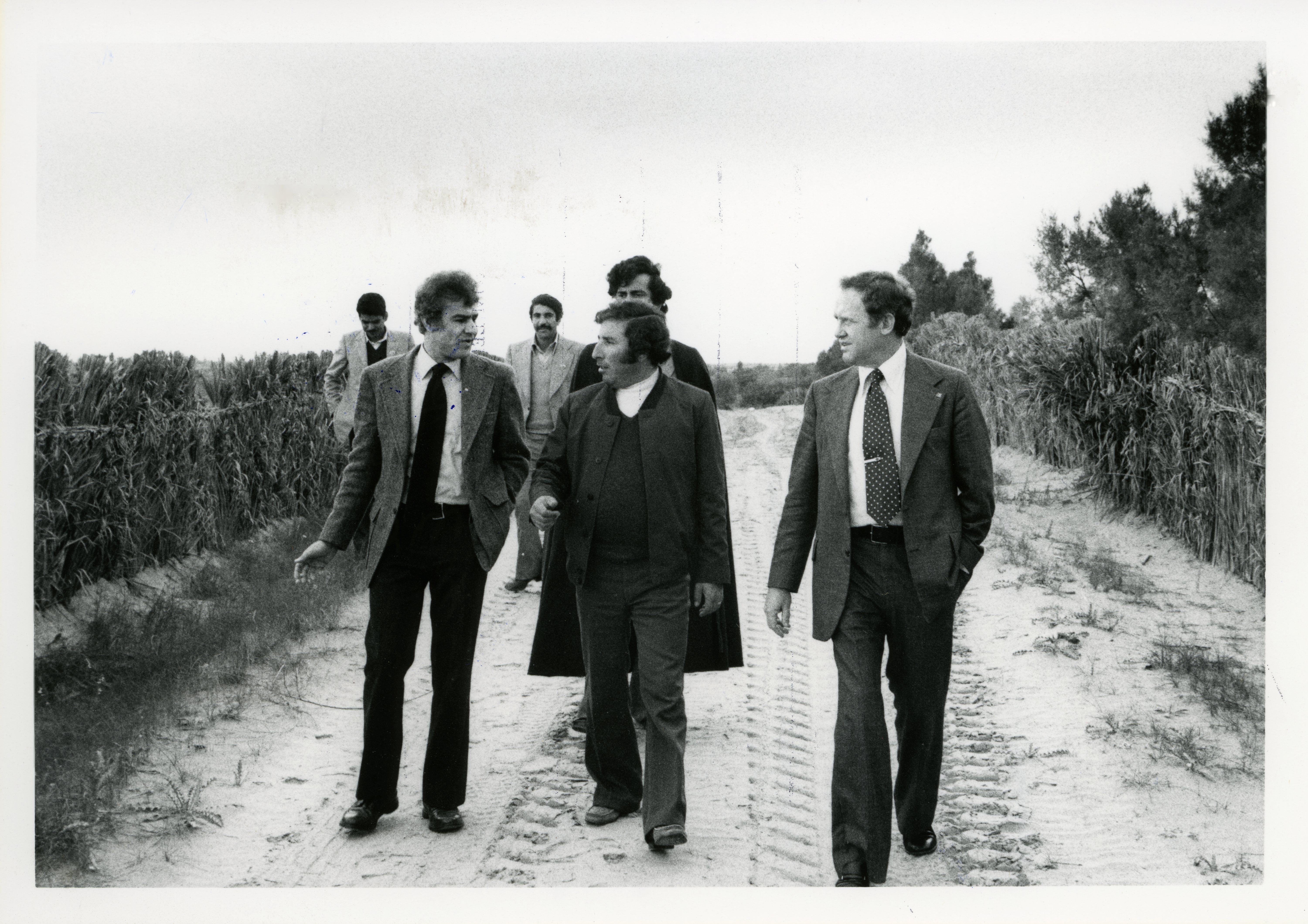- Senator James A. McClure and unknown others walk on a road in Libya.