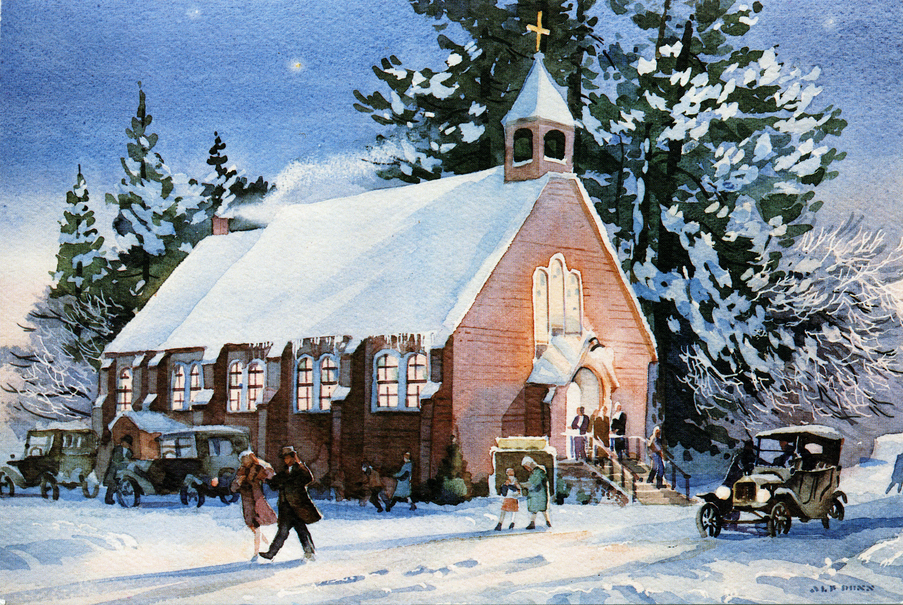 - James A. and Louise McClure developed this Christmas card depicting the Fort Sherman Chapel in Fort Sherman, Idaho.