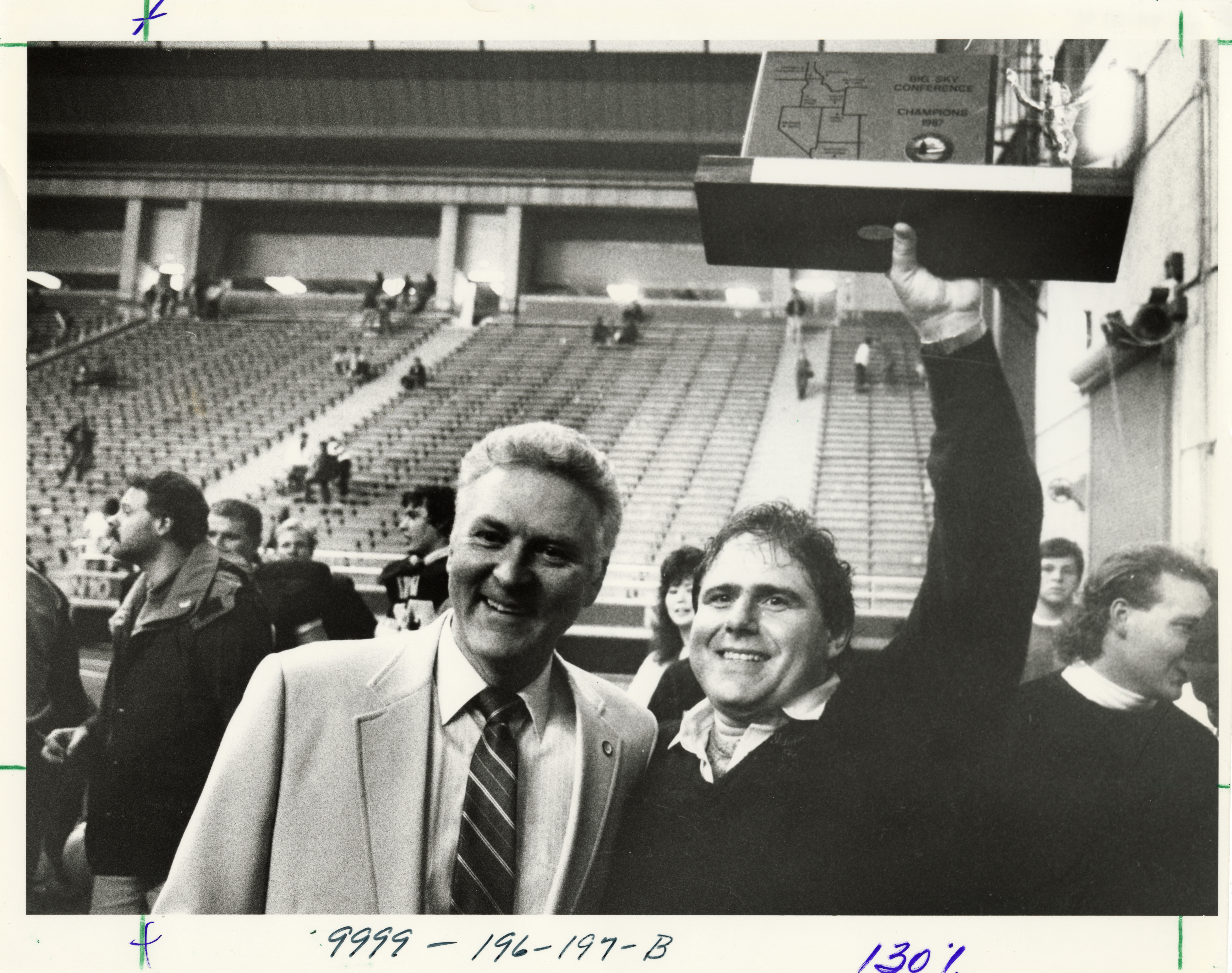 - Head football coach Keith Gilbertson holding the University of Idaho football team's Big Sky Conference Championship 1987 award