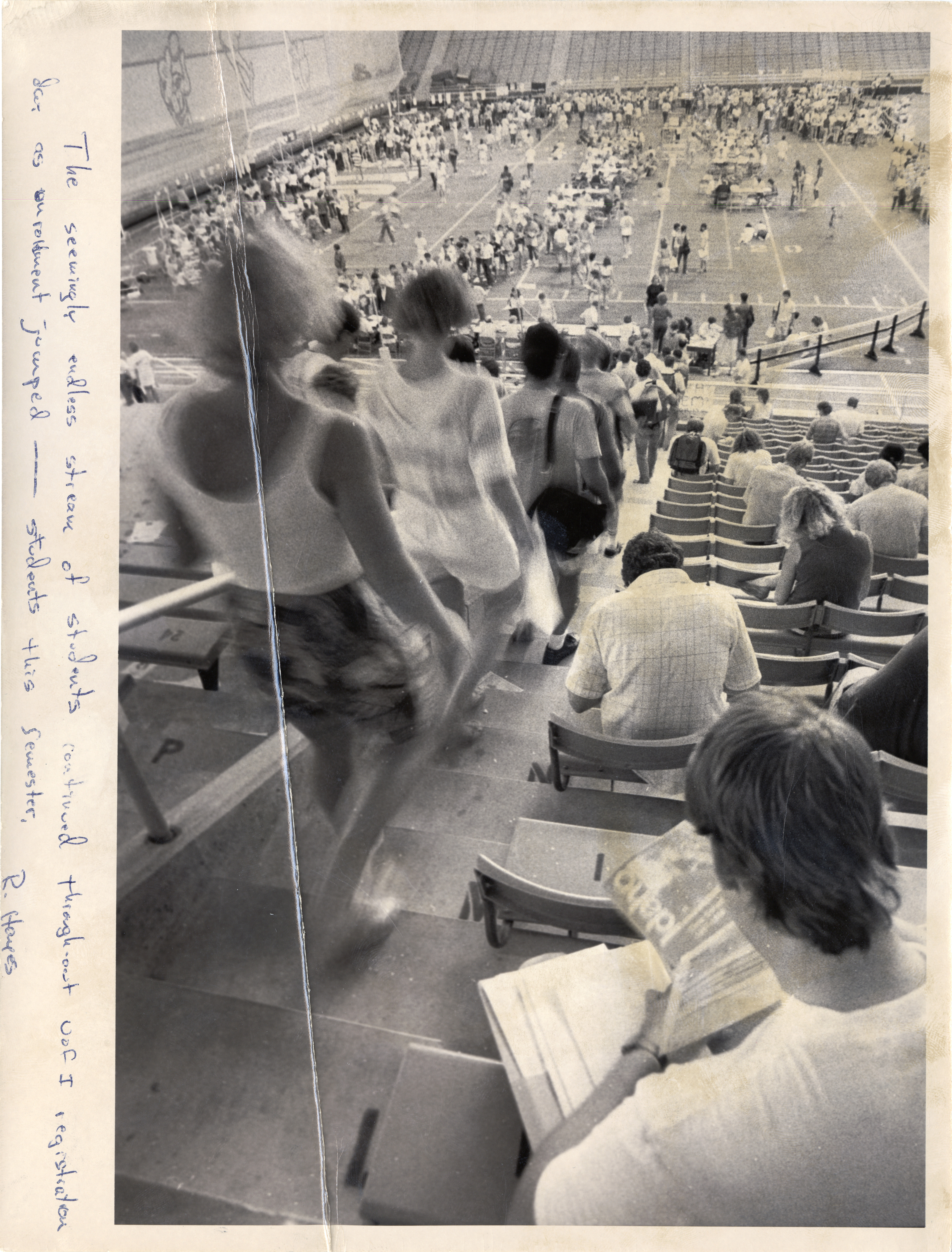 - Registration day 1987 in the Kibbie Dome. Inscription: "The seemingly endless stream of students continued throughout U of I registration day as enrollment jumped --- students this semester. R. Hayes"