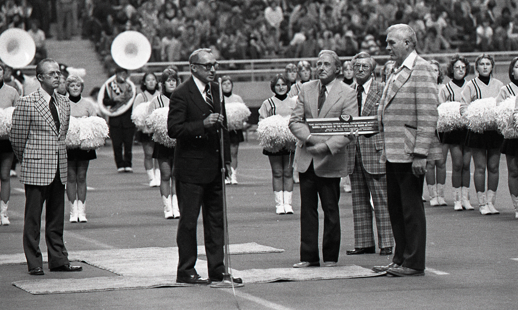 - President Ernest Hartung (third from right) and others at a 1976 football game. The plaque honors the Kibbie Dome construction.