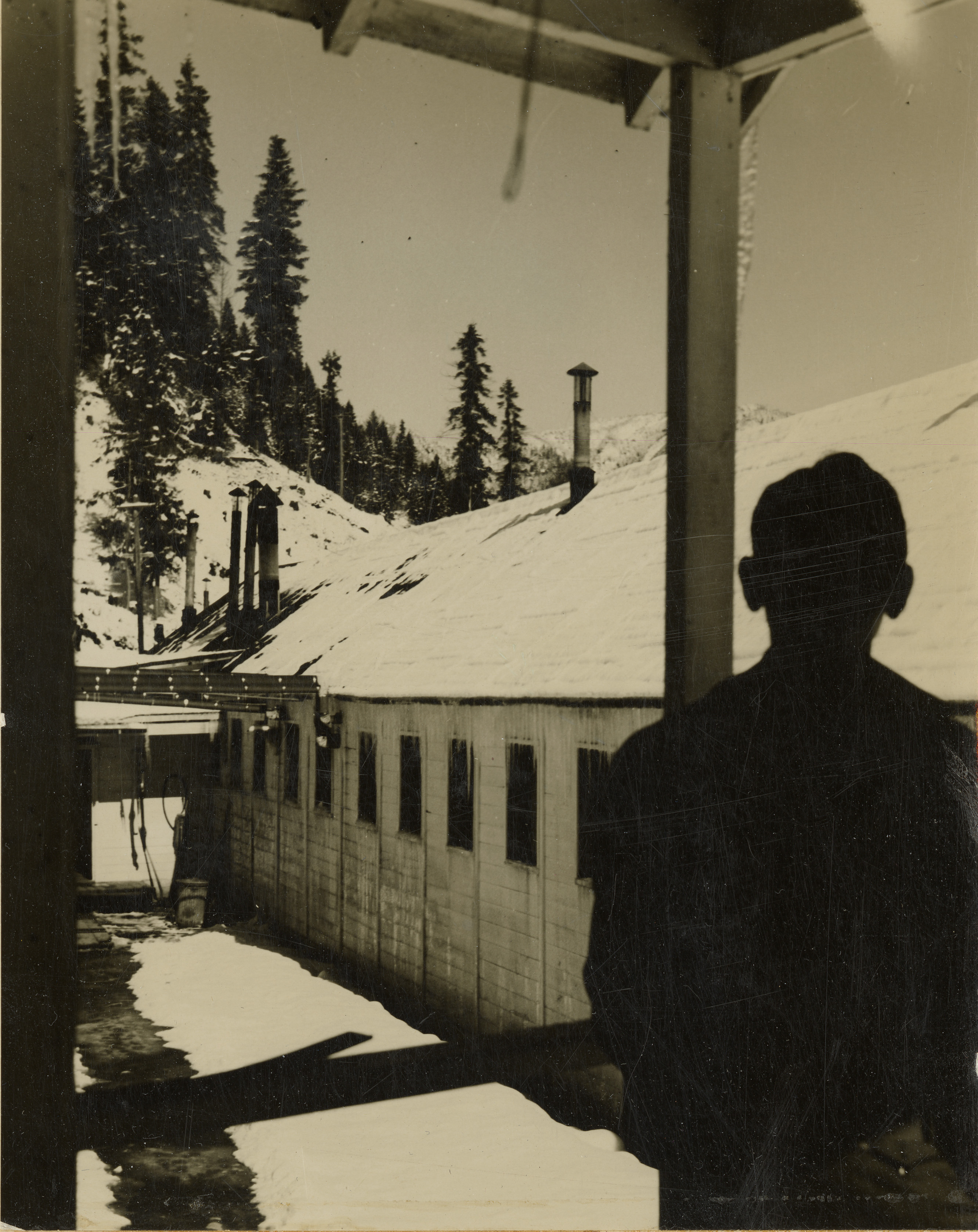 - Silhouette of a man looking out at the buildings at Kooskia Internment Camp in winter. Photo taken from 12-3/4 x 15-1/4 Photograph album of the Kooskia Japanese Internment Camp.