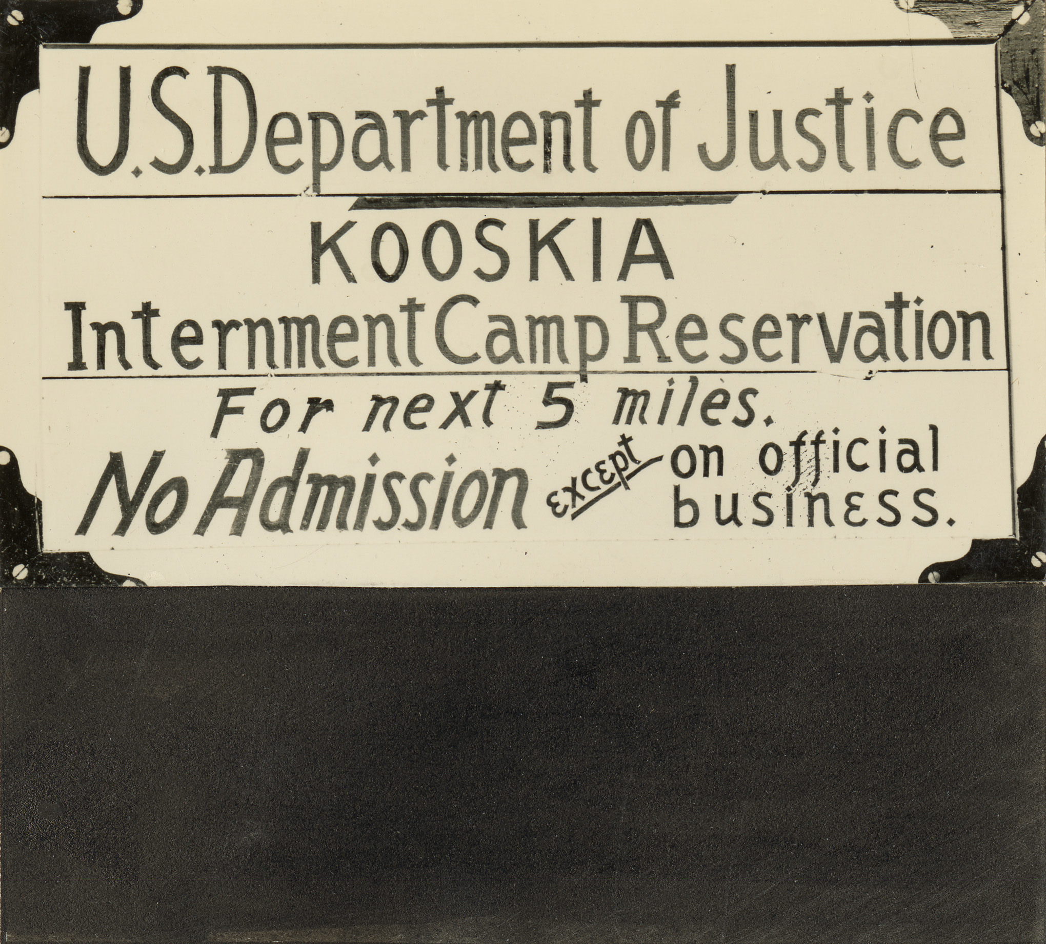- Image of sign at Kooskia Internment Camp reading, "U.S. Department of Justice Kooskia Internment Camp Reservation for next 5 miles. No Admission except on official business." Photo taken from 12-3/4 x 15-1/4 Photograph album of the Kooskia Japanese Internment Camp.