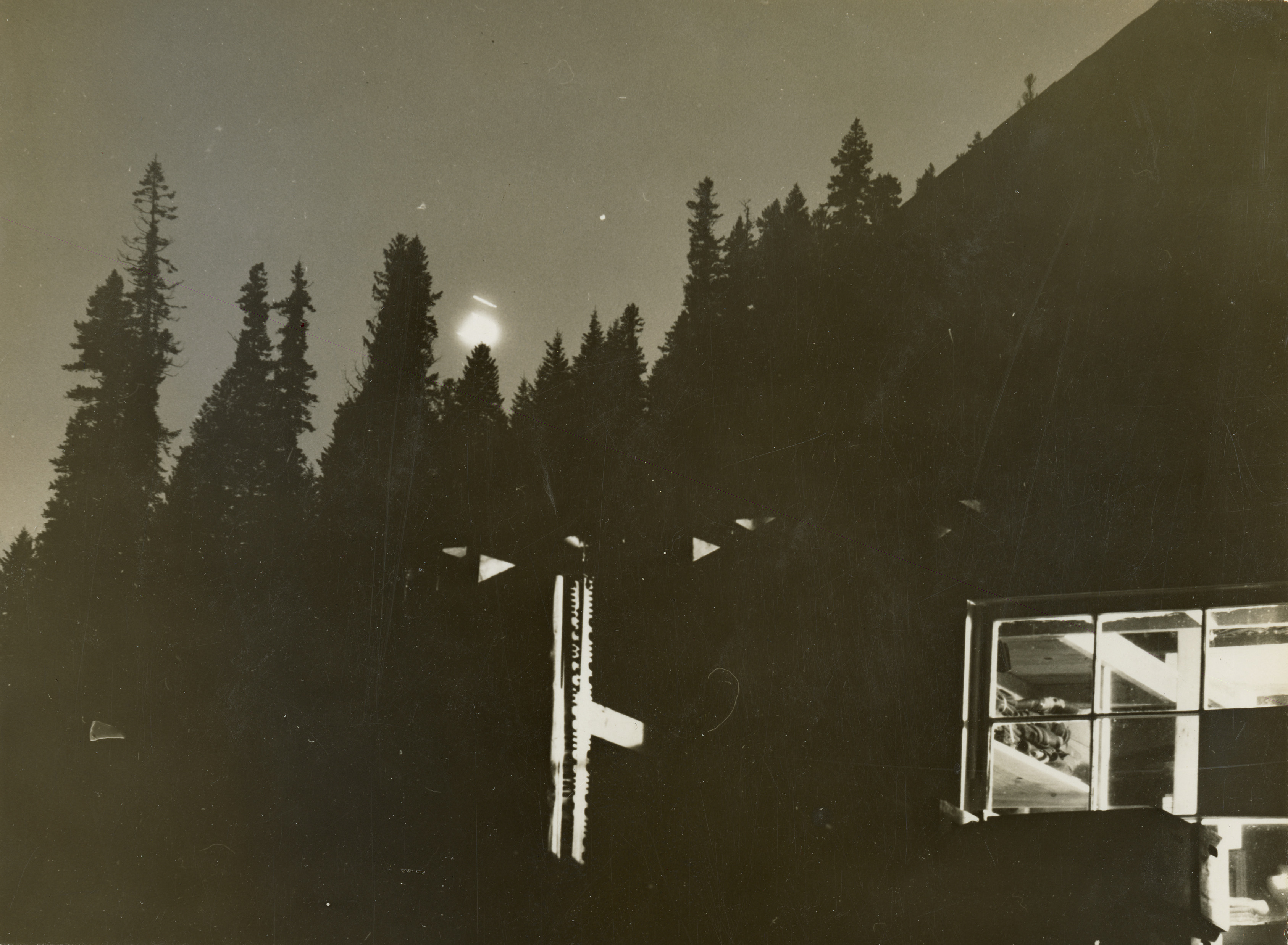 - Image taken during night at Kooskia Internment Camp of building with lights. Photo taken from 12-3/4 x 15-1/4 Photograph album of the Kooskia Japanese Internment Camp.