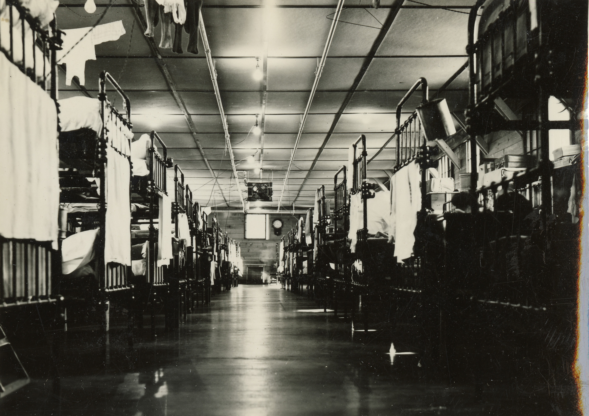 - Interior shot of rows of bunk beds at Kooskia Internment Camp. Photo taken from 12-3/4 x 15-1/4 Photograph album of the Kooskia Japanese Internment Camp.
