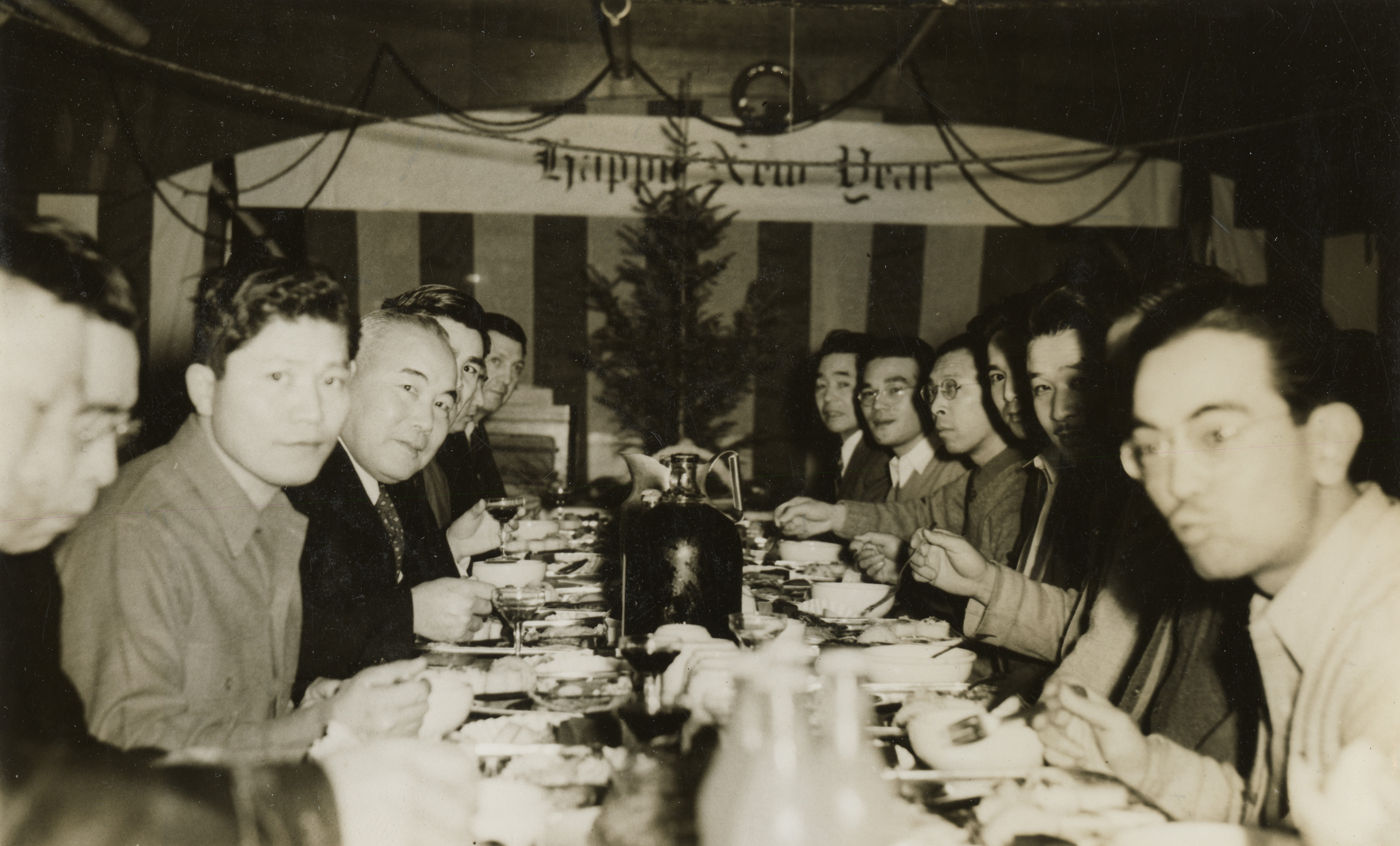 - Interior image of men sitting at a dining table with sign in the background reading "Happy New Year" at Kooskia Internment Camp. Photo taken from 12-3/4 x 15-1/4 Photograph album of the Kooskia Japanese Internment Camp.
