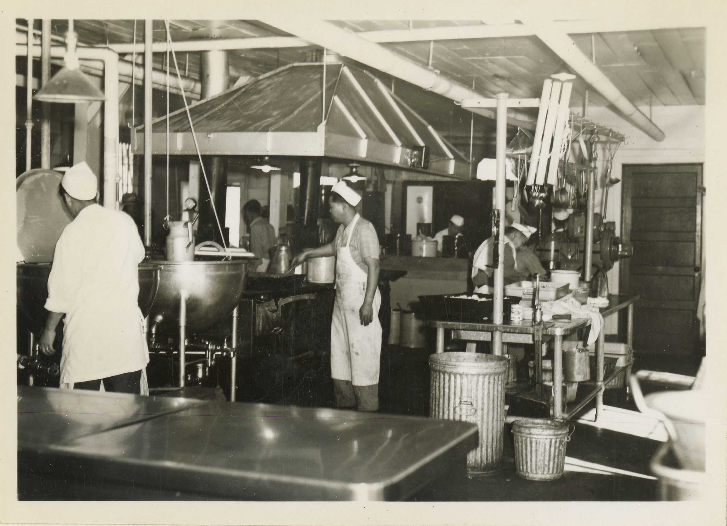 - Interior image of men working in kitchen at Kooskia Internment Camp. Photo taken from 12-3/4 x 15-1/4 Photograph album of the Kooskia Japanese Internment Camp.
