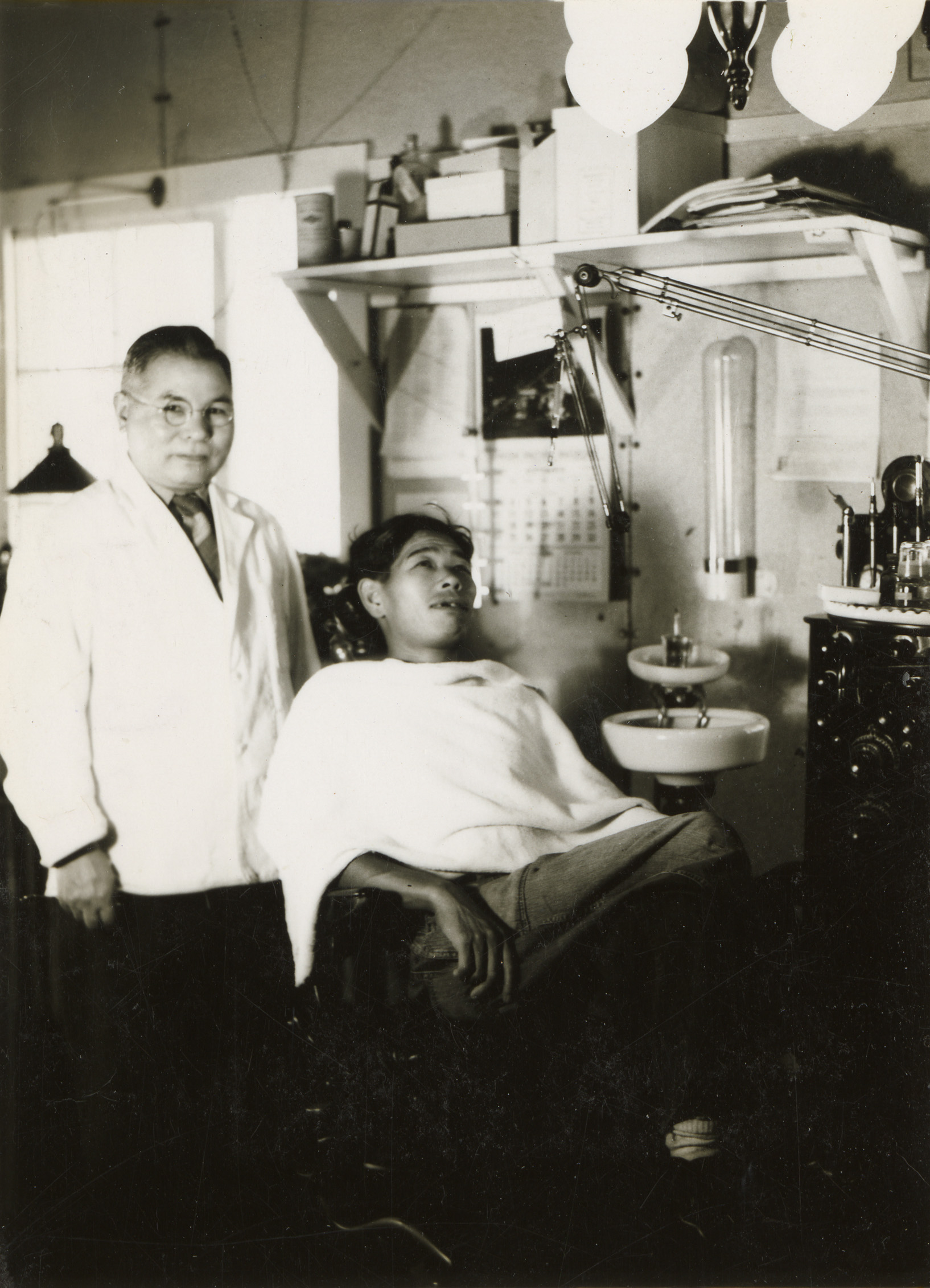 - Interior image of two men: one standing wearing a medical jacket, while other sits in dentist chair at Kooskia Internment Camp. Photo taken from 12-3/4 x 15-1/4 Photograph album of the Kooskia Japanese Internment Camp.