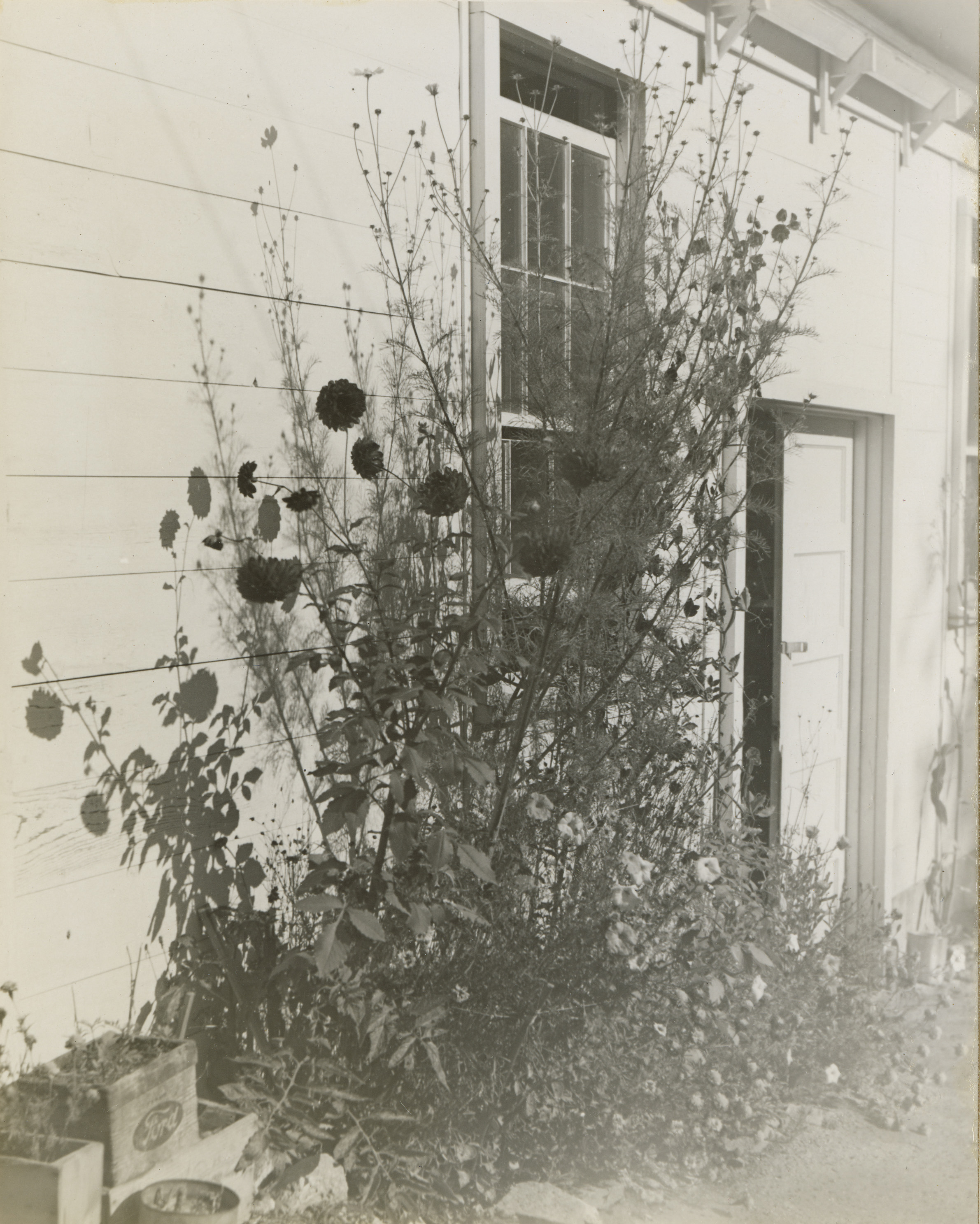 - Image of flowers in front of building at Kooskia Internment Camp. Photo taken from 12-3/4 x 15-1/4 Photograph album of the Kooskia Japanese Internment Camp.