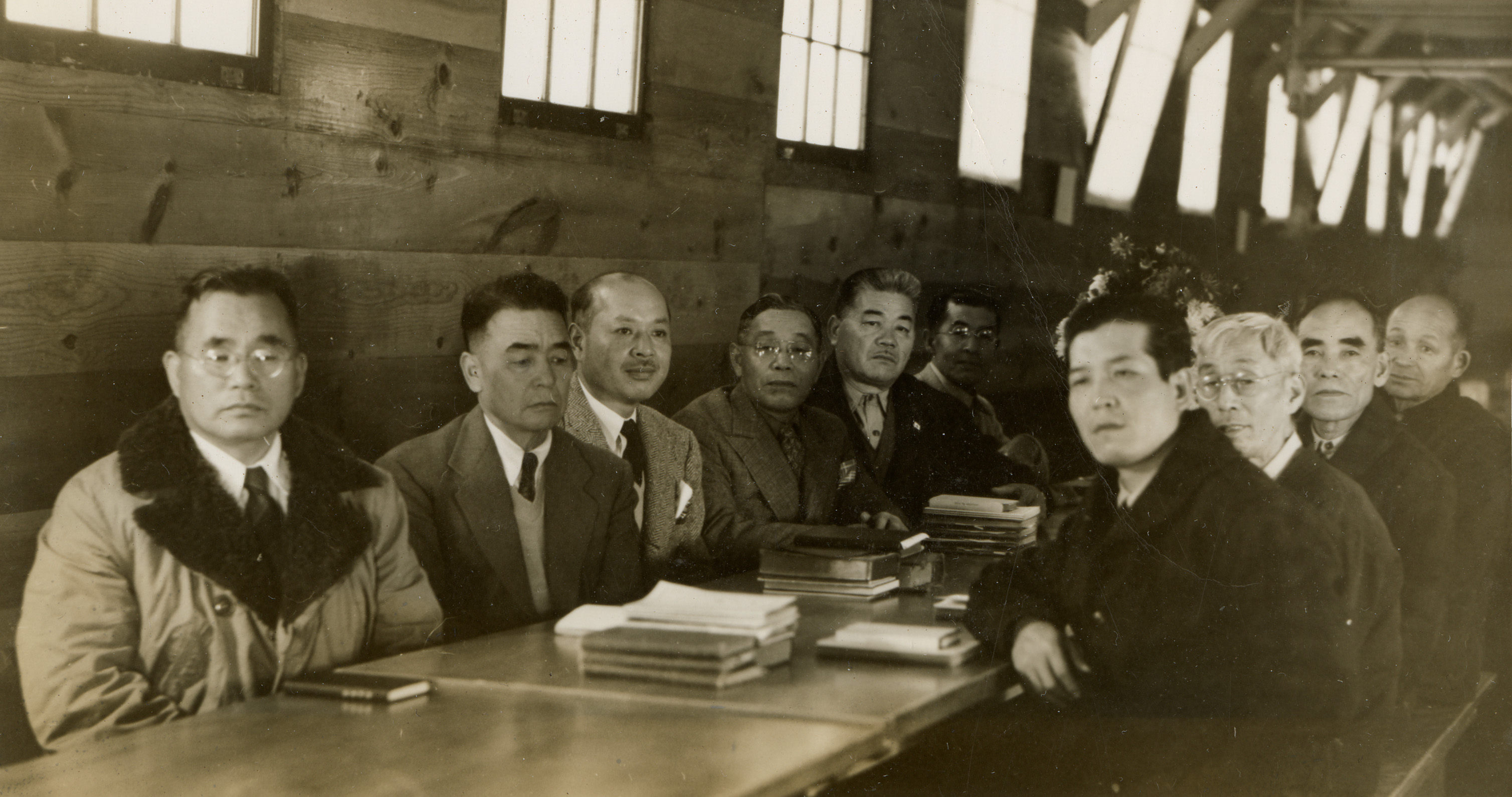 - Interior shot of group of men sitting at table for a meeting at Kooskia Internment Camp. Photo taken from 12-3/4 x 15-1/4 Photograph album of the Kooskia Japanese Internment Camp.