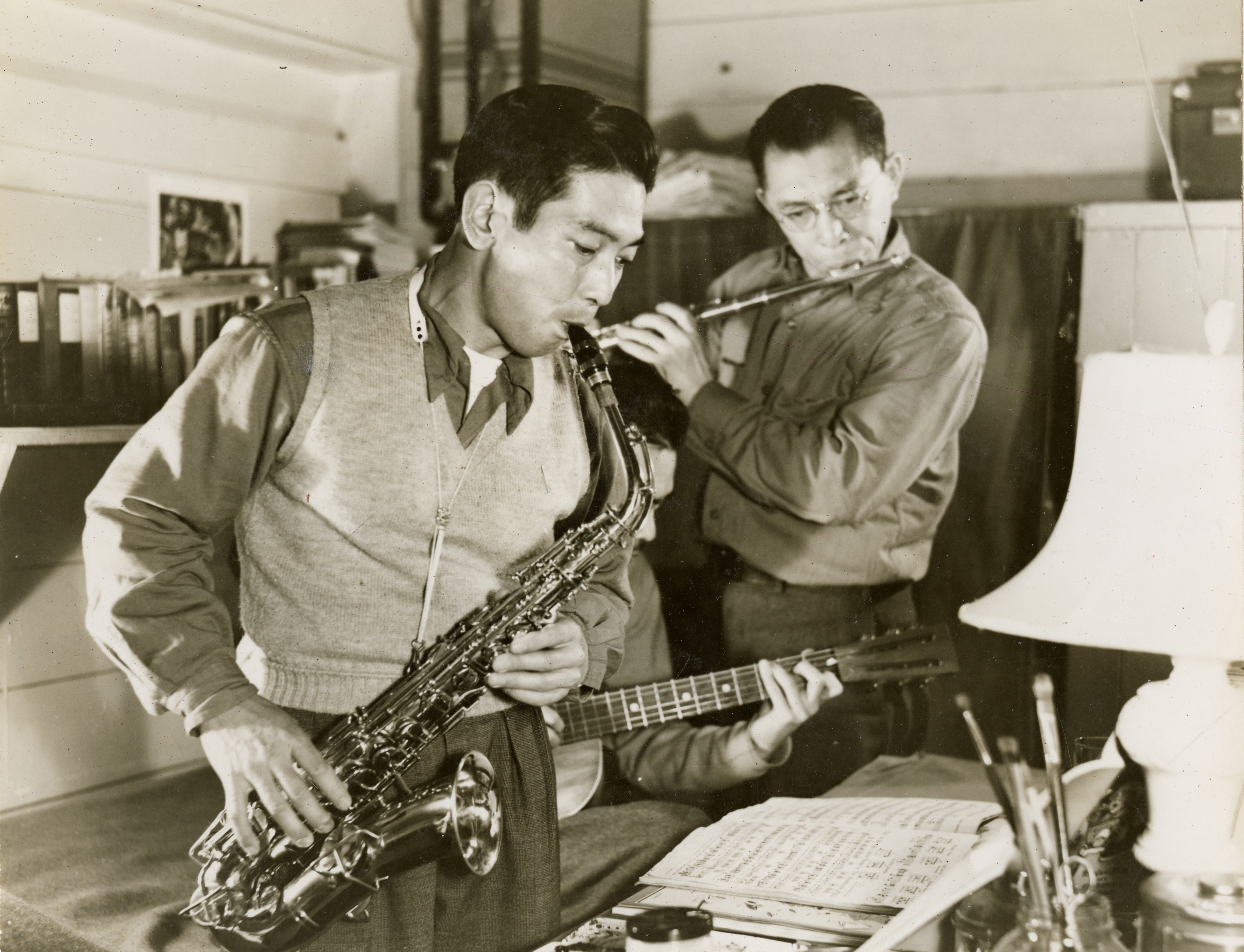 - Interior image of three men playing saxophone, guitar and flute at Kooskia Internment Camp. Photo taken from 12-3/4 x 15-1/4 Photograph album of the Kooskia Japanese Internment Camp.