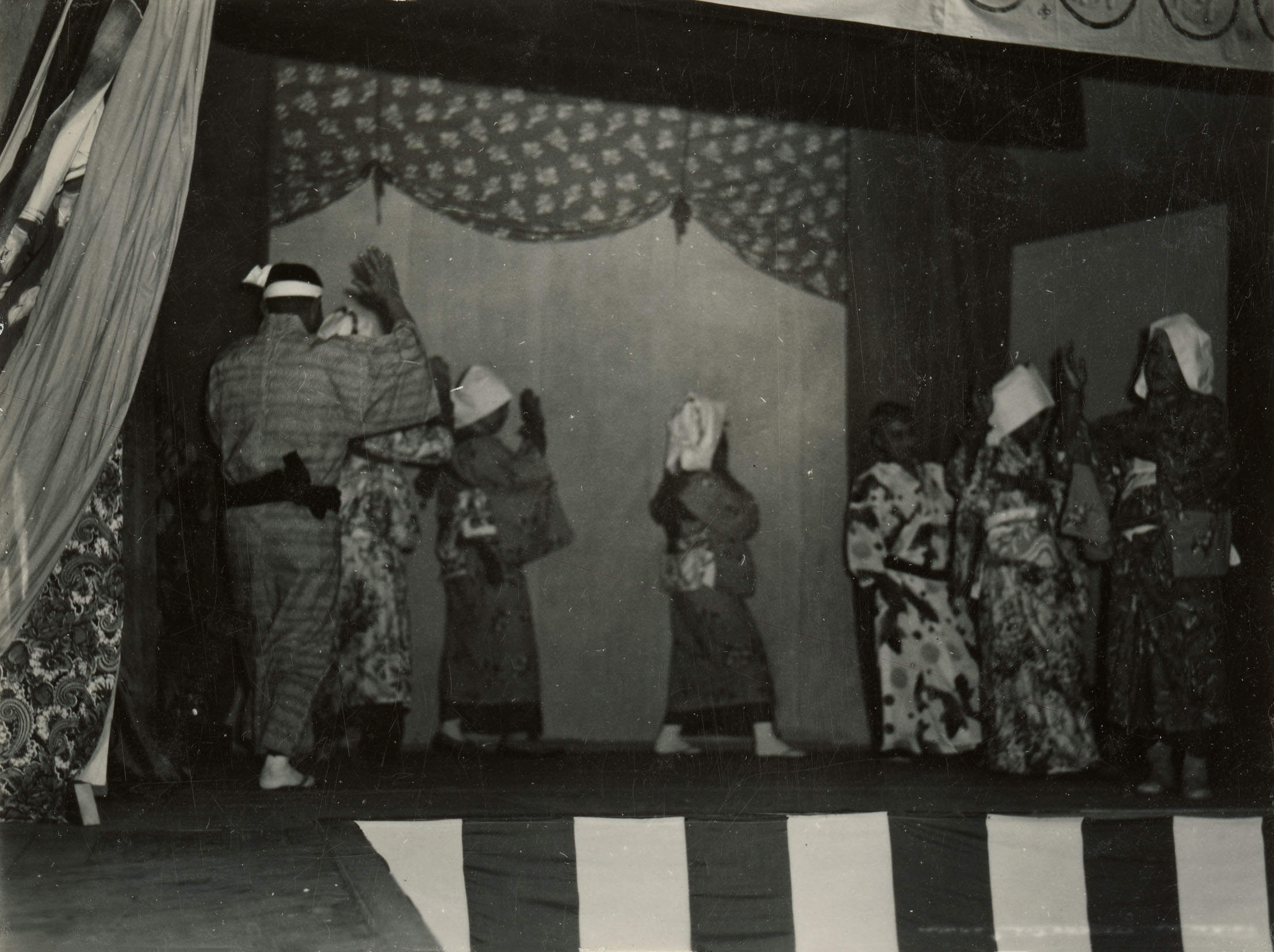- Interior shot of a staged performance with men wearing traditional clothing at Kooskia Internment Camp. Photo taken from 12-3/4 x 15-1/4 Photograph album of the Kooskia Japanese Internment Camp.