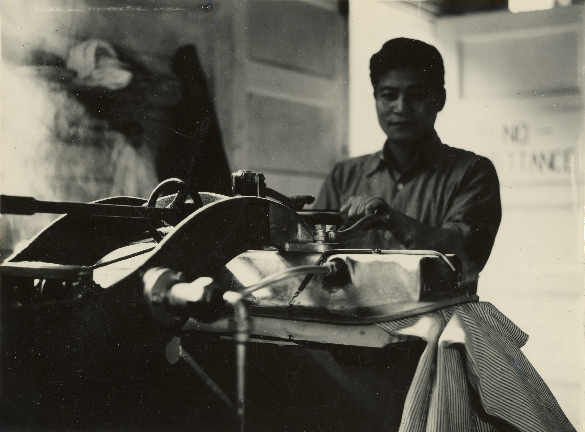 - Interior shot of man pressing clothes at Kooskia Internment Camp. Photo taken from 12-3/4 x 15-1/4 Photograph album of the Kooskia Japanese Internment Camp.
