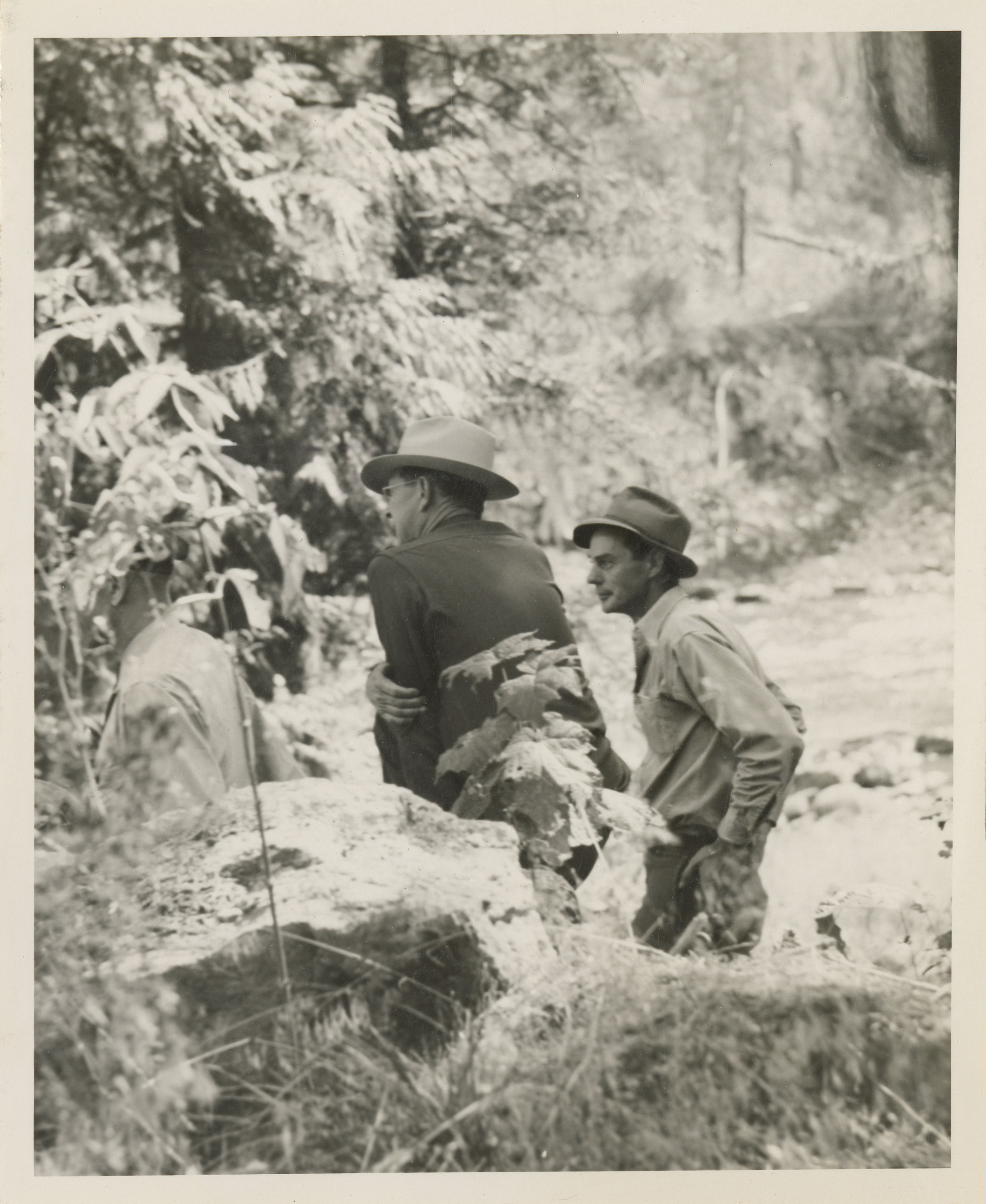 - Image of three men by the Lochsa Lochsa River at Kooskia Internment Camp as they oversee a construction team. Photo taken from 12-3/4 x 15-1/4 Photograph album of the Kooskia Japanese Internment Camp.