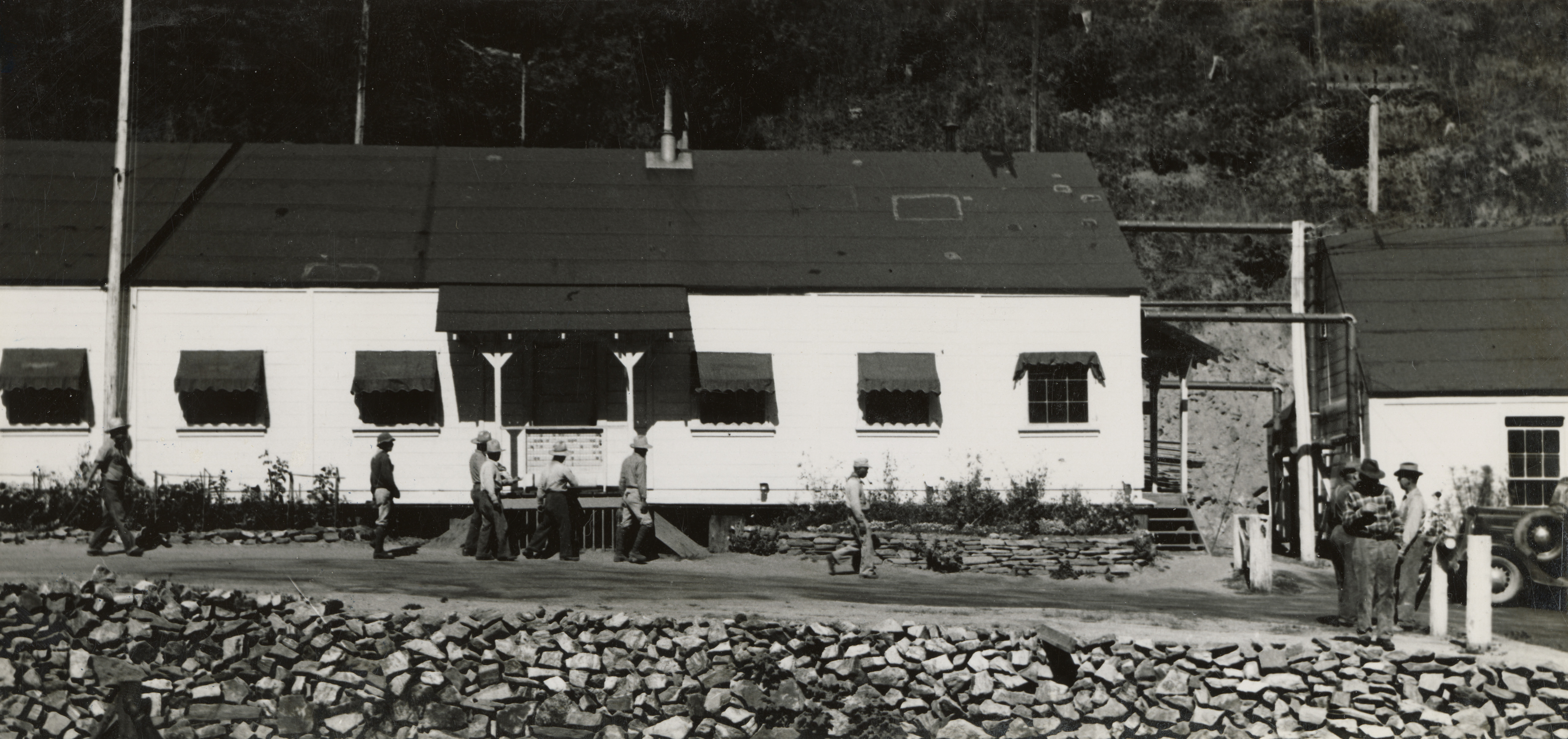 - Image of men coming back from or heading out to a construction project and removing their name discs from the check-in board outside a building at Kooskia Internment Camp. Photo taken from 12-3/4 x 15-1/4 Photograph album of the Kooskia Japanese Internment Camp.