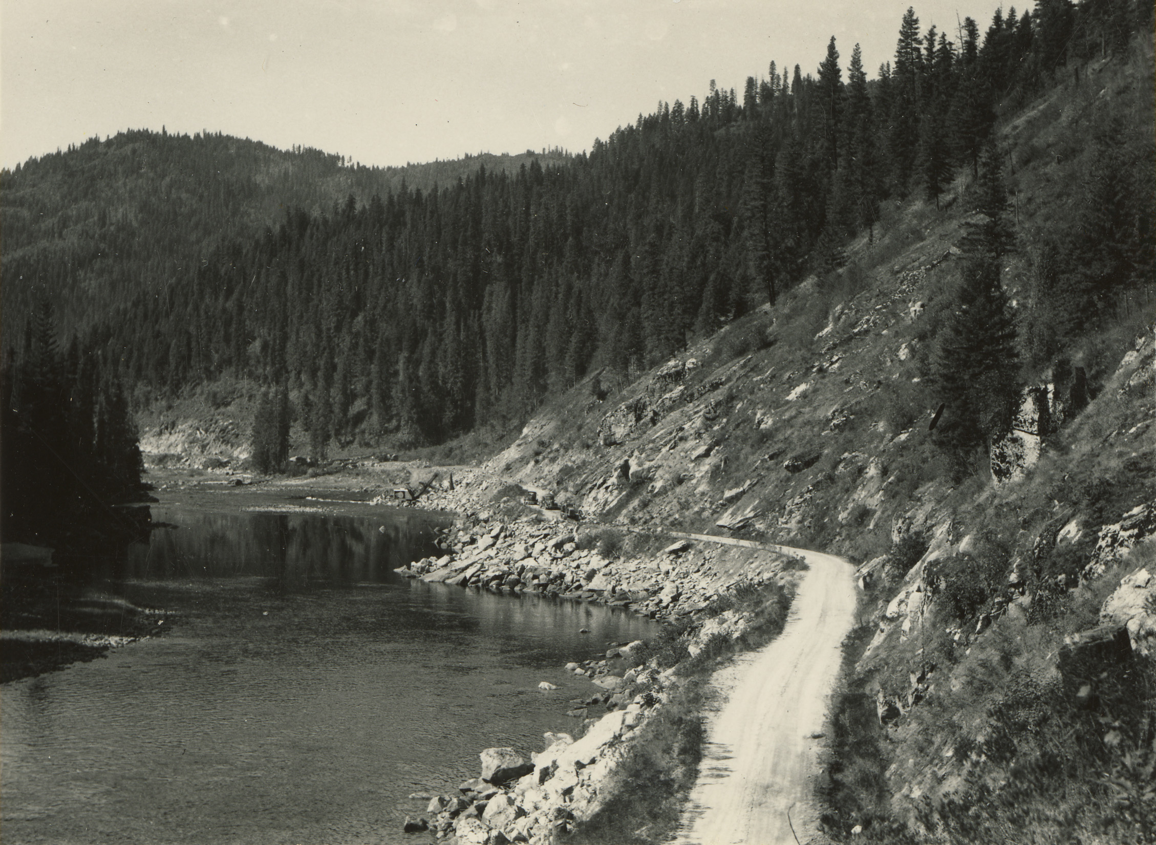 - Image of road beside the Lochsa Lochsa River near the Kooskia Internment Camp. Photo taken from 12-3/4 x 15-1/4 Photograph album of the Kooskia Japanese Internment Camp.