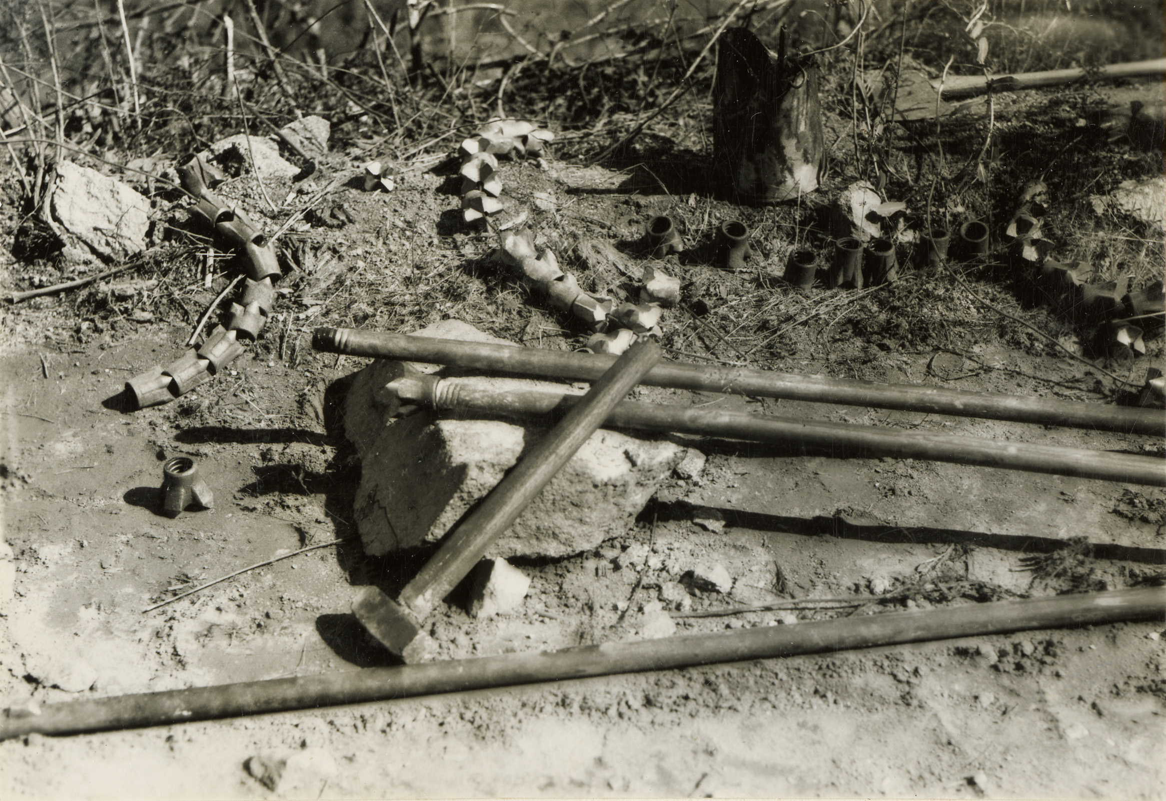 - Image of metal pipes laying on the ground at Kooskia Internment Camp. Photo taken from 12-3/4 x 15-1/4 Photograph album of the Kooskia Japanese Internment Camp.
