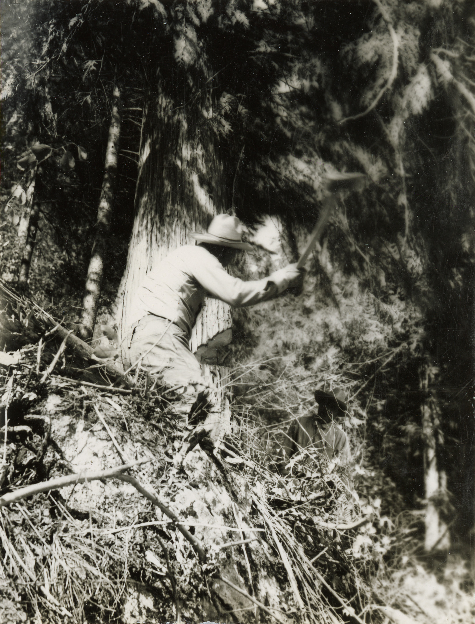 - Image of man cutting down tree with ax at Kooskia Internment Camp. Photo taken from 12-3/4 x 15-1/4 Photograph album of the Kooskia Japanese Internment Camp.