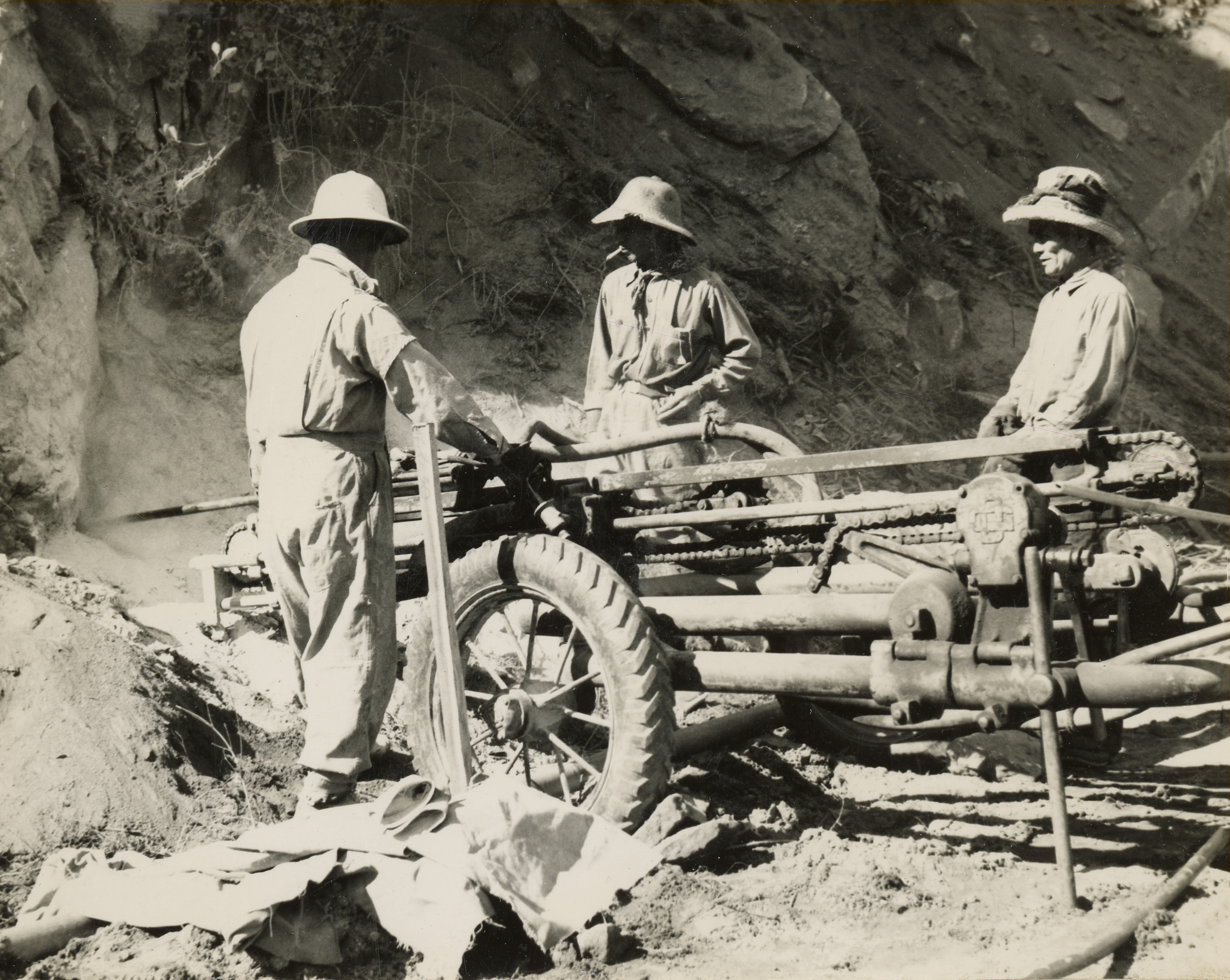 - Image of three men working with construction equipment at Kooskia Internment Camp. Photo taken from 12-3/4 x 15-1/4 Photograph album of the Kooskia Japanese Internment Camp.