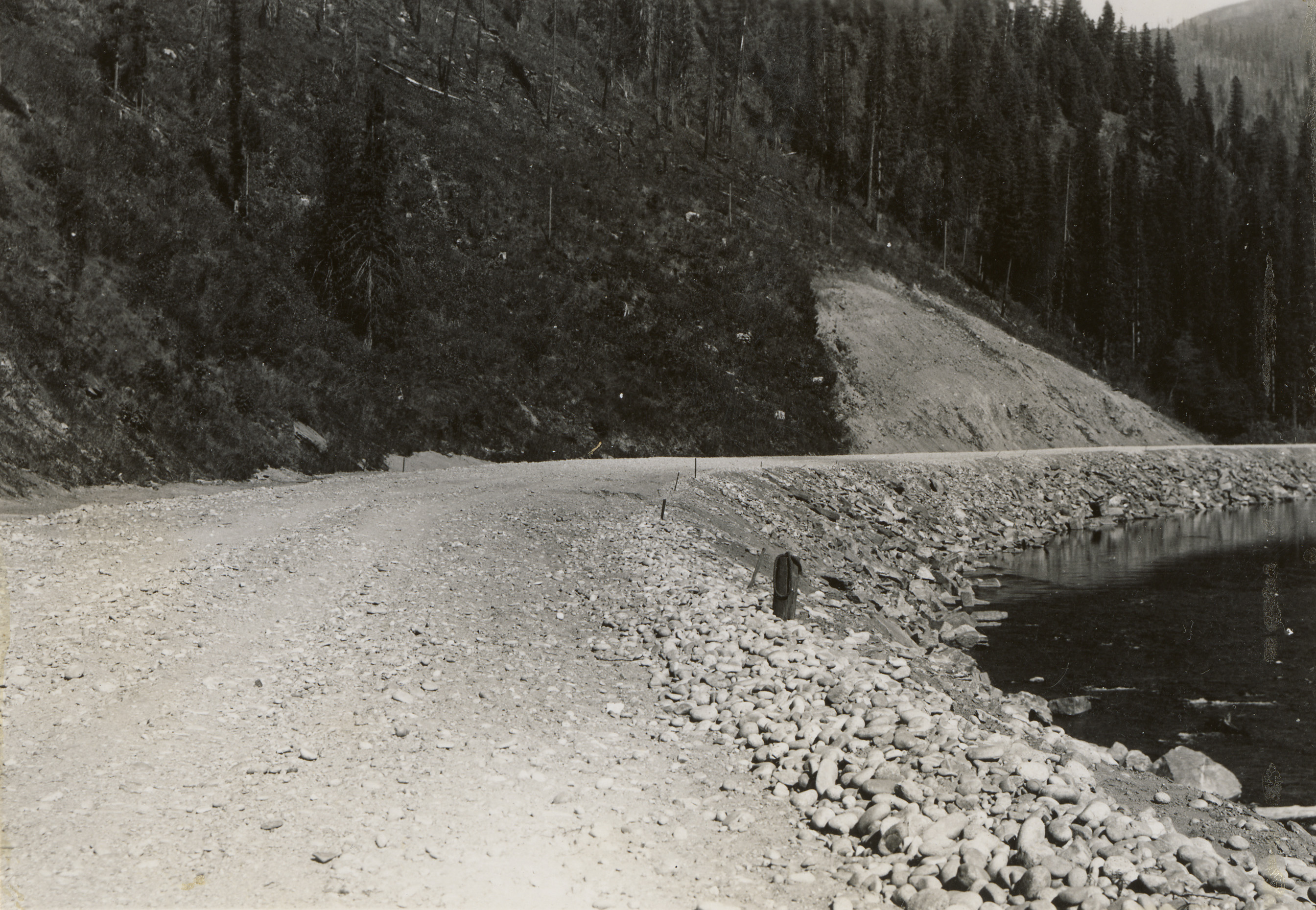 - Image of gravel road next to the Lochsa River near Kooskia Internment Camp. Photo taken from 12-3/4 x 15-1/4 Photograph album of the Kooskia Japanese Internment Camp.