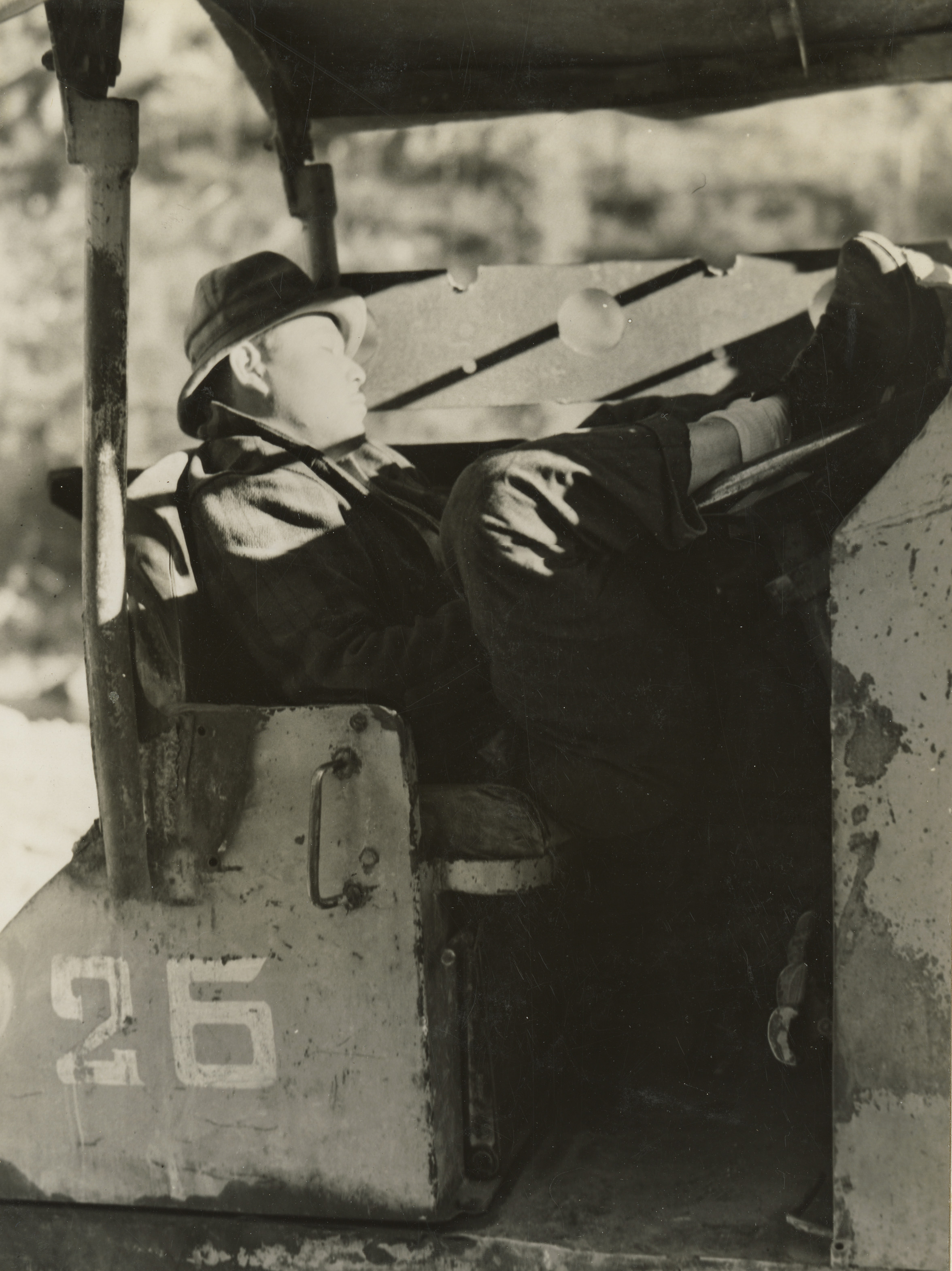 - Image of man napping in the seat of a piece of construction equipment at Kooskia Internment Camp. Photo taken from 12-3/4 x 15-1/4 Photograph album of the Kooskia Japanese Internment Camp.