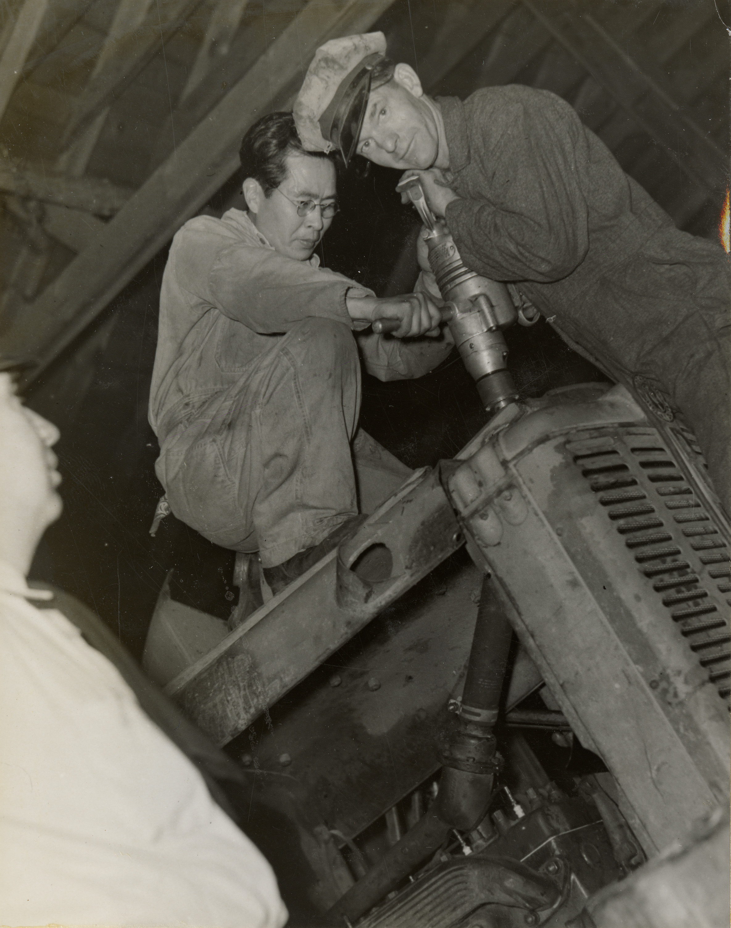 - Interior shot of two men working on top of machinery at Kooskia Internment camp. Photo taken from 12-3/4 x 15-1/4 Photograph album of the Kooskia Japanese Internment Camp.