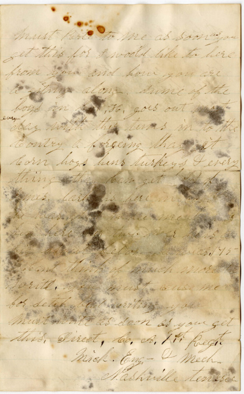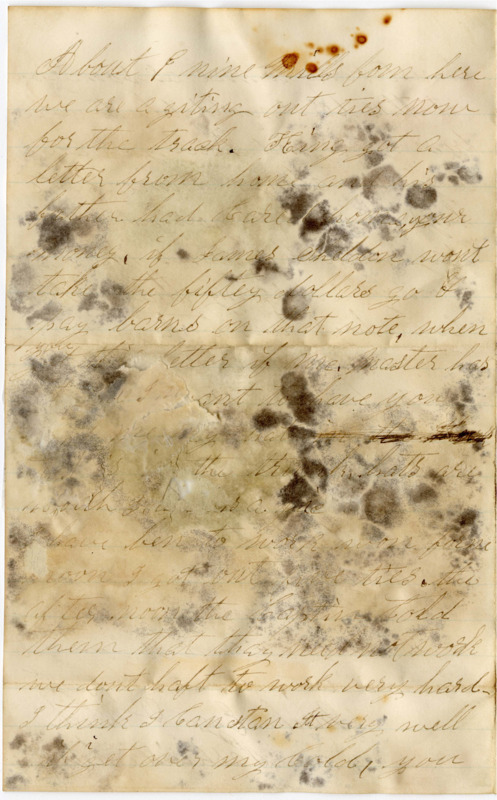 I begin to think it is about time for me to write to you Again. I am well to day as useal. I have Sume cold yet but not so bad as it was. We got here Wensday the 27. it has ben nice wether here but to day is Raney & damp. We have got our tent made and a Stove in it so we [ ] out to get along. We have flour to make bcis biscuit & we have buns Rise pork Coffe Suger. One man has to Cook for 17 hands. It is warm her there is no Snow her. It dont freeze Much. Thare is four Compenseys here, Co. A, G, H, I. thay say that the Rebls are About nine Miles form here. We are a giting out ties now for the track. King got a letter from home and his father had cared home your money. If James Sheldon wont take the fiftey dollars go & pay barns on that note. When you get this letter if McMaster has [ ] I want to have you [ ] me my hat in the [ ] t[ ] hats are worth [ ] a [ ] I hev ben to work [ ] I got out five ties the after noon the Captin told them that they need not work we dont haft to work very hard. I think I can stan it very well if I get over my Cold. You must Rite to me as soon as you get this for I woold like to here from you and how you are a giting along. Sume of the boys in Co. H. goes out most day with ther tems in to the Contry a forgeing. Thay get corn hogs hens turkeys & every thing they can get hold of. James Lark is here in Co. H. he was glad to see me. He has ben here over two years he is a big stout fellow he weas 175. I Cant think of much more to write you must xcuse me for setch bad writing. you Must write as soon as you get this.