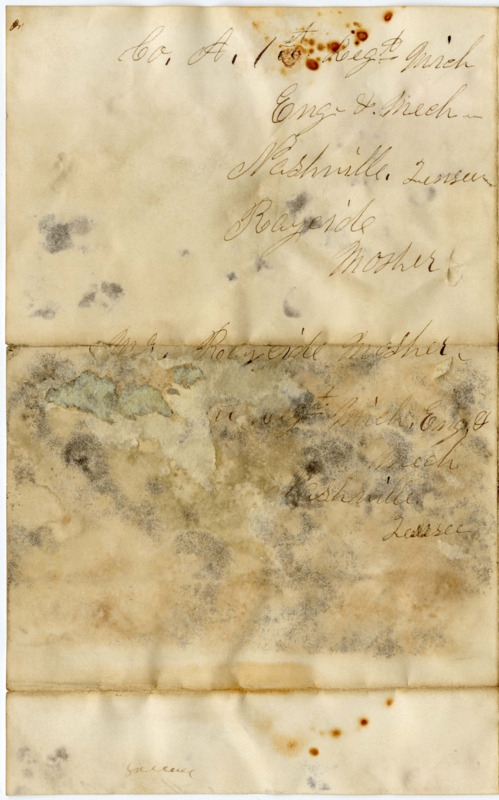 - Letter from Raycide Mosher to his father, Henry "Harry" Mosher, and mother, Sarah "Sally" Mosher; includes description of Raycide's experiences in his camp near Nashville, his health, and the companies in his regiment.