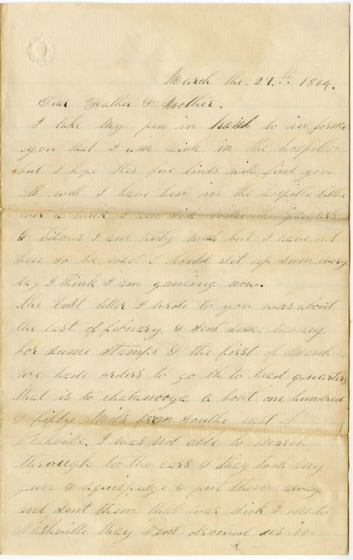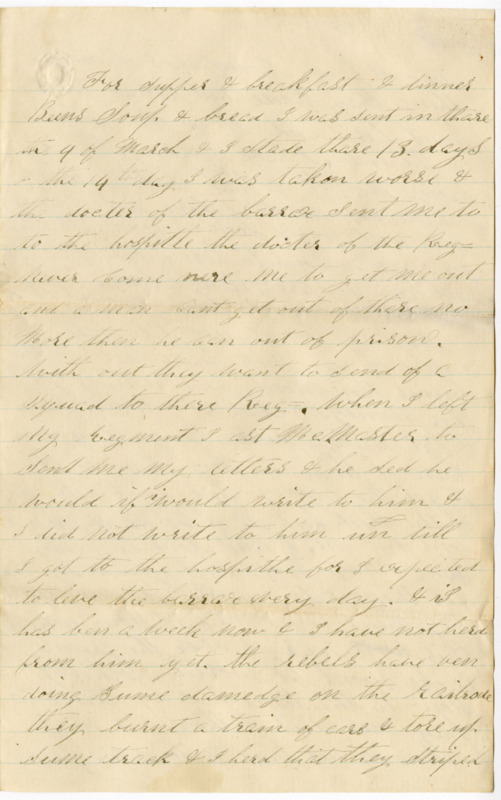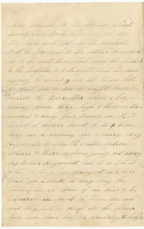 the last letter I wrote to you was about the last of febuary & Sent Sume money for sume stamps & the first of March we hade orders to go ~th~ to head quarters that is to chatanooga a bout one hundred & fifty miles from South east of Nashville. I was not able to march through to the cars & thay took my gun & aquipedge & put them away and sent them that war sick & me to Nashville thay sent drowed us in thare wagons to the Station about twenty five Miles then we got on the Cars and got up to Nashville Jest be fore dark & the dokter Com with us & he sent them that was the Sickest to the hospitle & I thought that he was agoing to send us all thare but he Sent me & Six or eight more to the barrax the zolercoffer house a large bilding seven story high & thare is three hundred & Sixty five Rooms in it. it is fool of Solders most of the time thay are a coming in every day Rigments of new of crutes vetron Solders & thare is Some going out every day to ther Regment, but it is fool all of the time in Spring it is a hard place for a man to Stay long the bilding is not done of in Side & the windows are most of them are out and thay haft to Sleep on the flower they have bred beef or Sowbeley & Coffee For Supper & breadfast & dinner Beens Soup & bread. I was sent in thare the 9 of March & I Stade thare 13. days the 14th day I was takon worse & the docter of the barrax Sent me to the hospitle the docter of the Reg= never come nere me to get me out and a man cant get out of thare no more then he can out of prison. With out they want to Send of a Squad to there Reg=. when I left my regment I ast McMaster to send me my letters & he Sed he would if i would write to him & I did not write to him un till I got to the hospitle for I expected to leve the barrax every day. & it has ben a week now & I have not herd from him yet. the rebels have ben doing Sume damedge on the railrode they burnt a train of cars & tore up Sume track & I herd that they Striped two of our Compnes of every thing thay hade but what to I hant herd and all of the Solders on the trane. I have wating to here from Mc M. & that is the resion I have not wrote before but I hope you will write Soon as you get this for I am anchous to here from you and how you are agiting along.