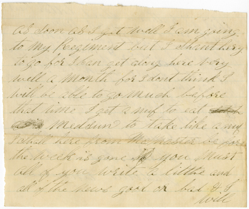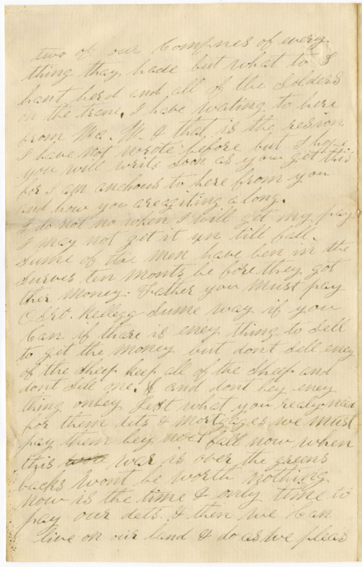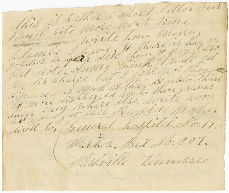 I do not no when I will get my pay I may not get it un till fall. Sume of the men have ben in the Surves ten monts be fore they got ther money. Father you must pay Osro Kellegg Sume way if you Can if thare is eney thing to Sell to get the money but dont sell eney of the Sheep keep all of the Sheep and dont Sell one. and dont bey eney thing onley Jest what you realy need for them dets & mortgages we must pay them bey next fall now when this wore war is over the greens backs wont be worth nothing now is the time & only time to pay our dets & than we Can live on our land & do as we pleas. As Soon as I get well I am going to my Regiment but I Shant hery to go for I can get along here very well a month for I dont think I will be able to go much before that time. I get a nuf to eat setch as is Medsun to take like a nuf I shall here from McMaster be fore the week is gone you must all of you write a little and all of the news good or bad & I will this is rather a Short letter but I will rite more next time. Write how meney lambs I have. If thare is hay or potatoes to spar sell them & pay Osro that note. Sume think I will get my dis charge but I gess not they discharge as much as they mus to thare is more discharged in to there graves then eney whare else write soon as you get this. Raycide Mosher