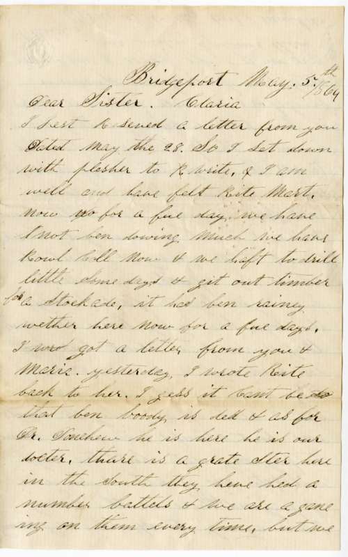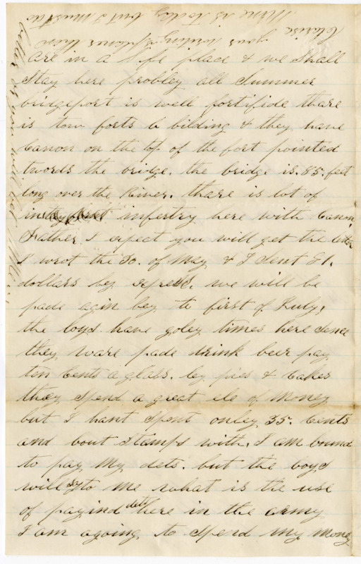 I Jest Reseved a letter from you Dated May the 28. So I Set down with plesher to R write. I am well and have felt Rite Mart. now uo for a fue day we have not ben dowing much we have Rowl Coll Now & we haft to drill little Some days & git out timber for a Stockade. it has ben rainey wether here now for a fue days. I wro got a letter from you & Maria yesterday I wrote Rite back to her. I gess it Cant be to that ben boody is ded & as for Dr. Donehew he is here he is our docter. thare is a grate Ster here in the South they heve hed a number battels & we are a ganeing on them every time. but we are in a Safe place & we Shall Stay here probley all Summer bridgeport is well fortifide thare is tow forts a bilding & they have Canon on the top of the fort pointed towards the bridge. the bridge is .85. feet long over the River. thare is lot of interyferet infertry here with Canon. Father I expect you will get the letter I wrot the 20. of May & I Sent 81. dollars by express. we will be pade agin bey the first of July. The boys have goley times here Sence they ware pade drink beer pay ten Cents a glass. bey pies & Cakes they Spend a great ele of Money but I hant Spent onley 35. Cents and bout Stamps with. I am bound to pay my dets. but the boys will say to me what is the use of paying det here in the army I am agoing to Spend my money and have a good time while I am here for if I should be Shot they Say wat good would my money dow me to Send it home. I told them I did not Care I would Send it home & if I Should get kild it would do Some one Some good. If I Should git home a live I would have Some thing to help me a long. We had a foot race the other day a white man & a negro they put up 30. dollars & thare was some side bets & they went down on a flat a little way from Camp. Most the hole Rigment was thare to see them Run & the Curnel was thare & the ground was past of they was to Run 30 Rods they was jugs to each end & they pooled ther boots & pants of & run with ther drowes on they Run thrue it the white betit the it was a Smart Race but Some men was not Sadistfied they ting think the niger can bet the man yet the whit man is a Smart man he offers to bet one hundred dollars