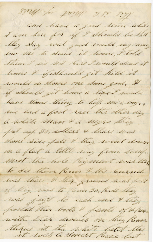 - Letter from Raycide Mosher to his sister, Clarissa Mosher; includes description of the activities of Raycide's army unit and life in camp, such as a foot race.