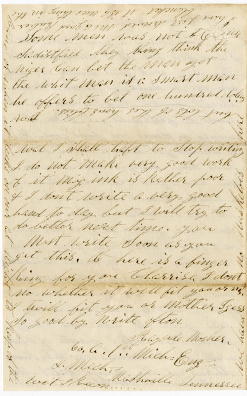 Wal I shall haft to Stop writing I do not make very good work of it my ink is Rether poor & I dont write a very good hand to day but I will try to do better next time. you must write Soon as you get this & here is a finger Ring for you Clarrisa I dont no whether it will fit you or not I twill fit you or mother I gess So good by write ofton