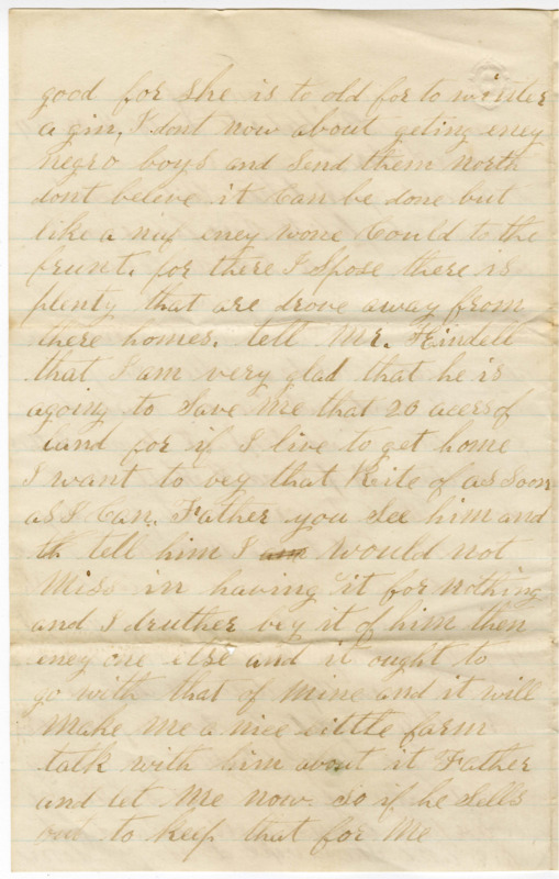 I Reseved your letter this morning and was glad to here from you I am getting well I shall be able to go to my Compney be fore long I hope thes fue linds will find you all well. I wrote a letter to you the 27. and put in it twenty five dollars and Sent it to you Father & Mother to p and I Shall Send Some more to you next pay day you must let me now how much wheat there is when you thresh it and the wool you say you got 74 Cents a pound So my wool must heve come to 74 dollars for they ought to Cut a hundred pound 26 Sheep. Father you May take that old Seep that I put in with the lambs last fall and fat her and She will do you Some good for She is to old for to winter agin. I dont now about geting eney negro boys and Send them north dont beleve it Can be done but like a nuf eney wone Could to the frunt. for there I Spose there is plenty that are drove away from there homes. tell Mr. Hindell that I am very glad that he is agoing to Save me that 20 acers of land for if I live to get home I want to bey that Rite of as Soon as I Can. Father you See him and tell him I am would not Miss in having it for nothing and I druther bey it of him then eney one else and it ought to go with that of mine and it will make me a nice little farm talk with him about it Father and let me now So if he Sells out to keep that for me.