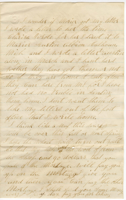 I wonder if Morier got my letter I wrote a letter to her the time Clarisa wrote for her I direct it to Marier Austin Albion Calhoun, Mich and I wrote a letter to Austin along in March and I hant herd wether they have got them or not So if they are home puty ofton they Can here from me for I heve not hed no truble in Sending them bane. I dont want them to take my letters out of the post office that I Write home.