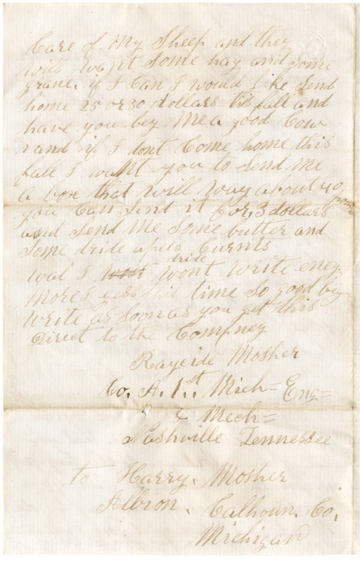 - Letter from Raycide Mosher to his family; includes description of labor and harvests related to the Mosher family farm, money issues, and the food items that Raycide would like sent to him.