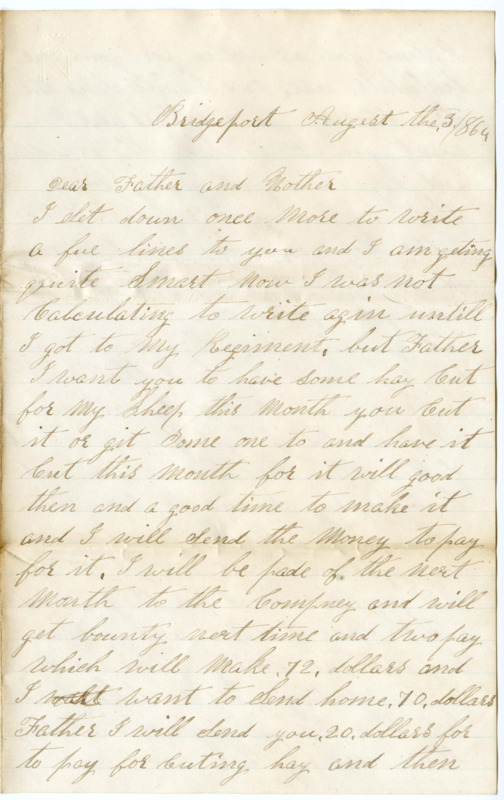 I Set down once more to write a fue lines to you and I am geting quite Smart now I was not Calculating to write agin untill I got to my Regiment. but Father I want you to have Some hay cut for my Sheep this month you cut it or git Some one to and have it cut this month for it will good then and a good time to make it and I will Send the Money to pay for it. I will be pade of the next month to the Compney and will get bounty next time and two pay which will make .72. dollars and I will want to Send home .70. dollars Father I will Send you .20. dollars for to pay for Cuting hay and then I Send you .25. dollars for your one benfichels use. and I will Send the other twenty five dollars and I want you to take the 25. dollars and bey me a good young Cow that is Coming this fall will be better for you. bey a good nice one as you Can find and not over five yers years old.