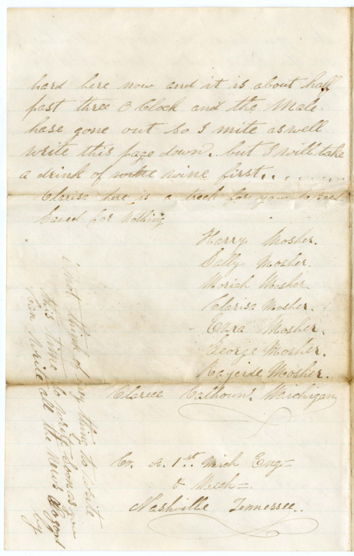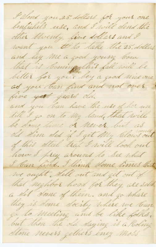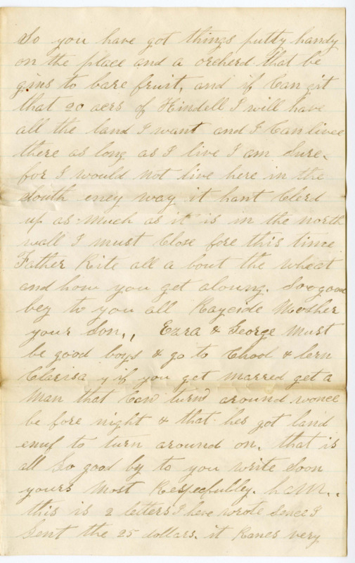 and you Can have the use of her un till I go on to my land. that will be Some time or never but as old Sim Sed if I get my Clows wonce out of this Steel trap I will look out how I prey around to See what I Can find. I think Some times that we ought Sell out and get out of that neghbor hood for they are setch a Set Some of them. and go whare they is Some Socity where we Can go to meeting and be like folks. but then the old Saying is a Roling Stone nevers gethers eney Moss So you have got things putty handy on the place and a orcherd that be gins to bare fruit, and if Can git that 20 acrs of Hindell I will have all the land I want and I Can live there as long as I live I am Sure for I would not live here in the South eney way it hant Clerd up as much as it is in the north wall I must Close fore this time Father Rite all a bout the wheat and how you get aloung. Soo good bey to you all Raycide Mosher your Son. Ezra & George must be good boys & go to Chool & lern Clarisa if you get marred get a Man that Can turn around wonce be fore night & that hes got land enuf to turn around on. that is all So good by to you write Soon yours most Respecfully. I am. this is 2 letters I heve wrote Sence I Sent the 25 dollars. it Ranes very hard here now and it is about half past three O Clock and the male hase gone out So I mite as well write this page down. but I will take a drink of whi wine first…