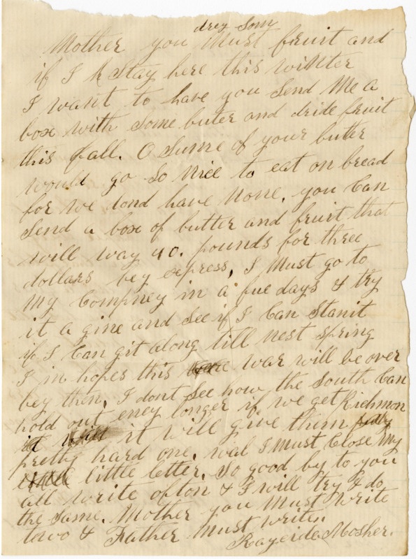 I write a fue linds this morning to you I am giting quite Smart and I hope thes fue lines will find you well. and the Rest of the folks. Clarisa here is a paper I Send to you to Read I get a paper every fue days thare is a man that fetches them around every fue days & gives them to the Solders in the hospital Father they Say that wheat is worth two dollars a bushel I hope it will keep so till you Can Sell ours it will fetch quite a little bit of money i wood would like to be thare and drive fread & John and plow & get in a good pece of wheat this fall. Father you must keep the Seed of that wheat for I bleve that is a good kind. Mother you must drey Som fruit and if I Stay here this winter I want to have you Send me a box with Some buter and dride fruit this fall. O Sume of your butter would go so nice to eat on bread for we dont have none. you can Send a box of butter and fruit that will way 40. pounds for three dollars bey express. I must go to my Compney in a fue days & try it a gine and See if I Can Stanit If I Can git along till nest Spring I in hopes this ware war will be over bey then. I dont See how the South Can hold out eney longer if we get Richmon it will it will give them puty pretty hard one. wal I must Close my little letter. So good by to you all write ofton & I will try & do the Same. Mother you Must write two & Father must write.